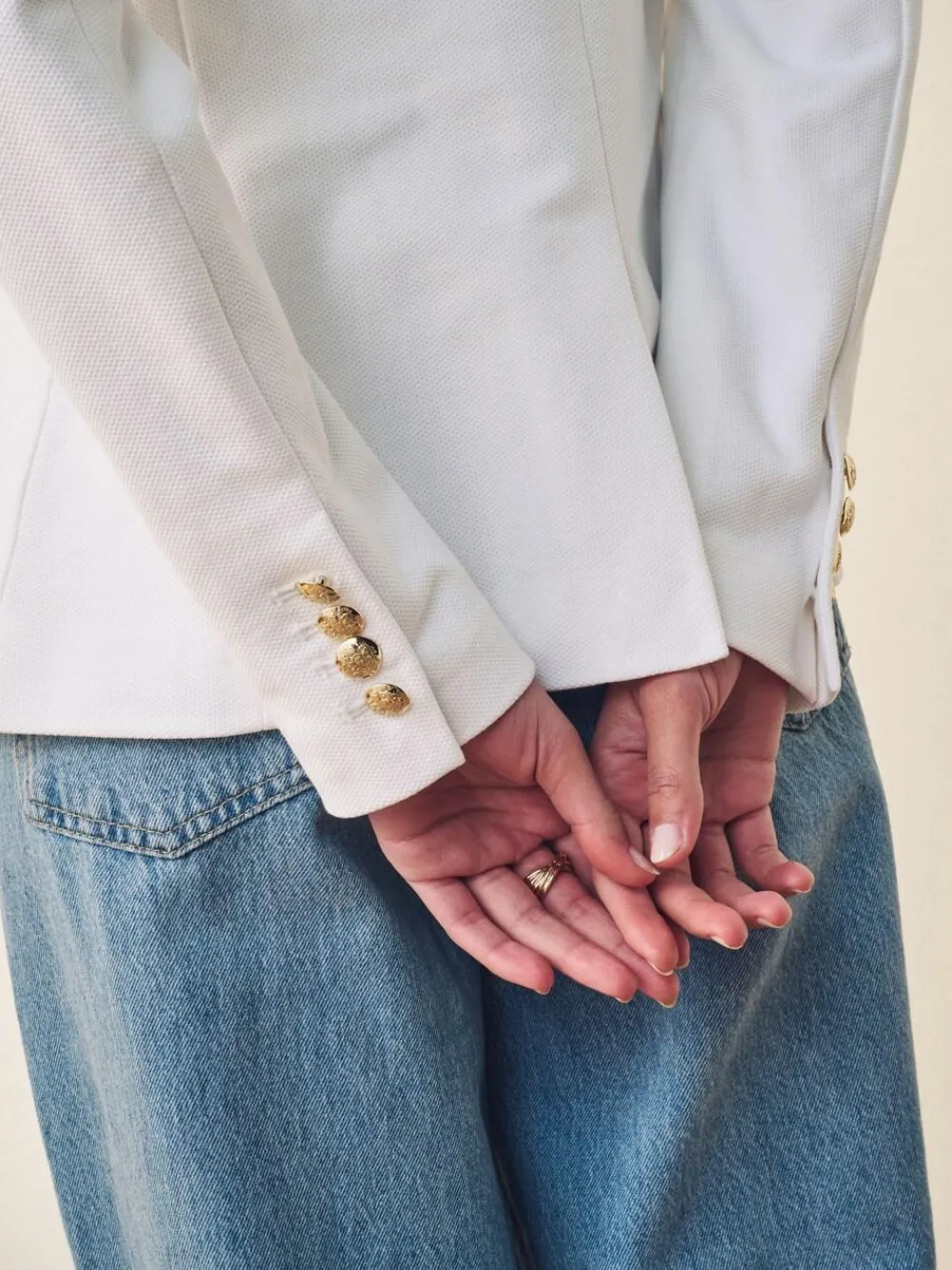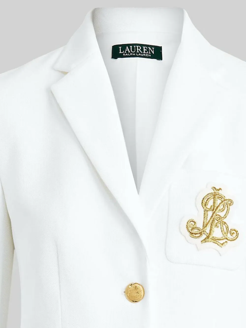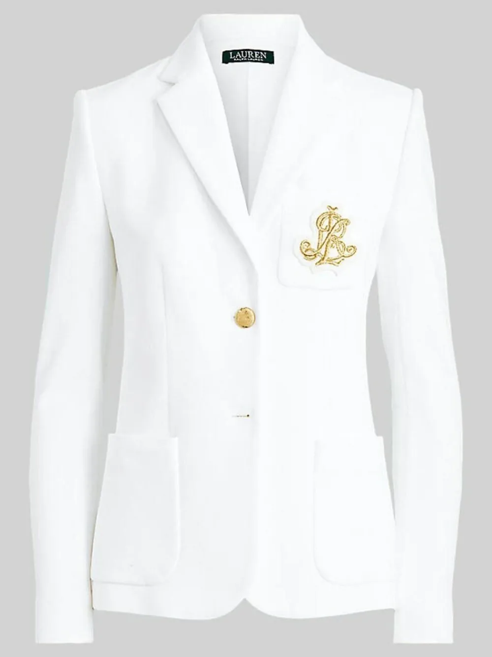 This chic jacquard white blazer embodies Lauren’s style with a signature bullion patch at the chest and luxurious crest-embossed buttons. Slim fit Intended to hit at the hip Size medium has a 25. 5” body length and a 32. 5” sleeve length Body length and sleeve length are taken from the centre back of the neck Sleeve length changes 0 75” between sizes Notch lapels Two-button silhouette Long sleeves with four-button cuffs Left chest patch pocket Two front waist patch pockets Crest-embossed buttons Outer 98% Cotton, 2% Elastane. Lining 94% Polyester, 6% Elastane.