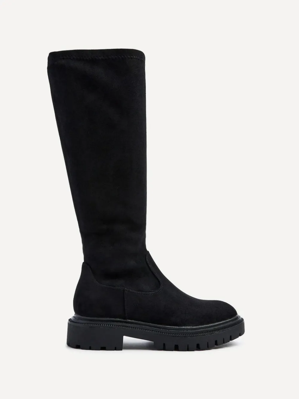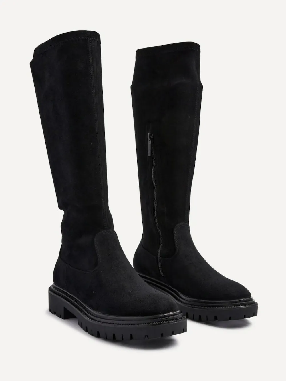 Our Best-Selling Hallie High Leg Boot is back. Its stretch faux suede seamlessly shapes your leg, ensuring a flawless fit every time. With a sturdy chunky sole and a cushioned padded in-sock, this boot offers unbeatable comfort for all-day wearability. Upper – Textile, Sole – Other Materials, Lining & Sock – Textile.