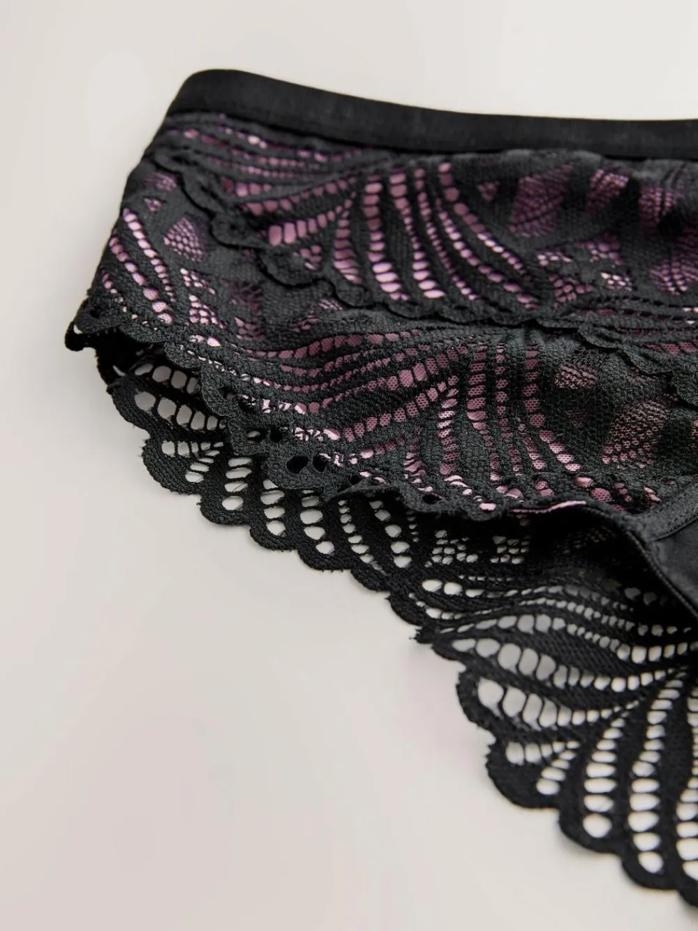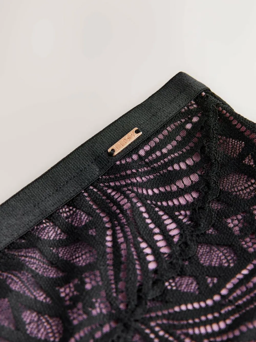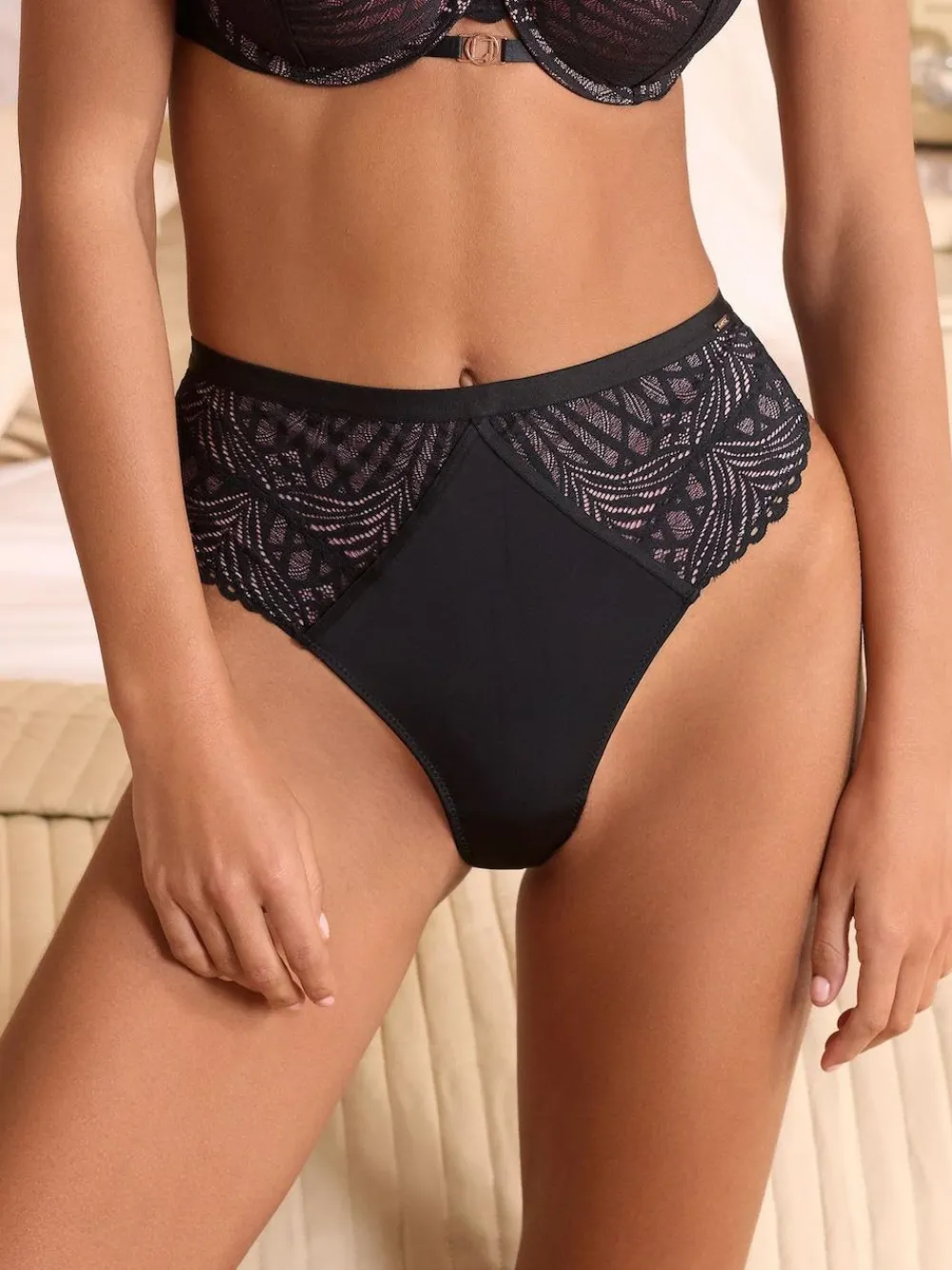 Define your silhouette with this striking high-rise knicker. Featuring a trendy high-leg cut and a flattering wide waistband, it showcases gorgeous black geo lace over a pink contrast base. Perfect for a luxurious lingerie look, its sophisticated design is finished with subtle branded hardware. High-rise, high-leg fit Geo lace detailing Branded hardware Coordinates with matching pieces Machine washable. Main 87% Nylon, 13% Elastane. Gusset 100% Cotton.