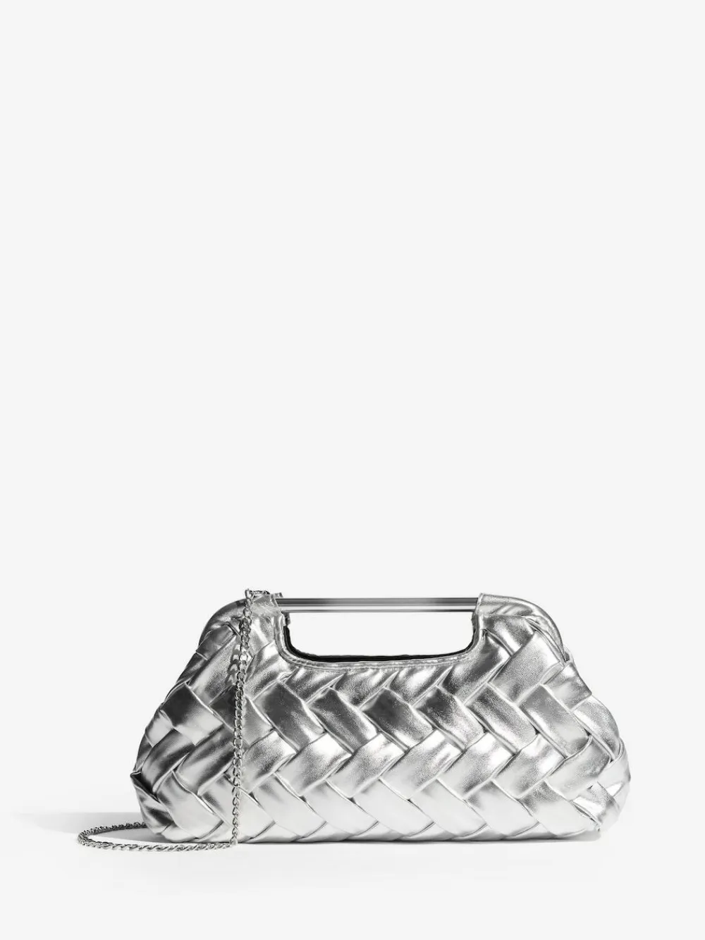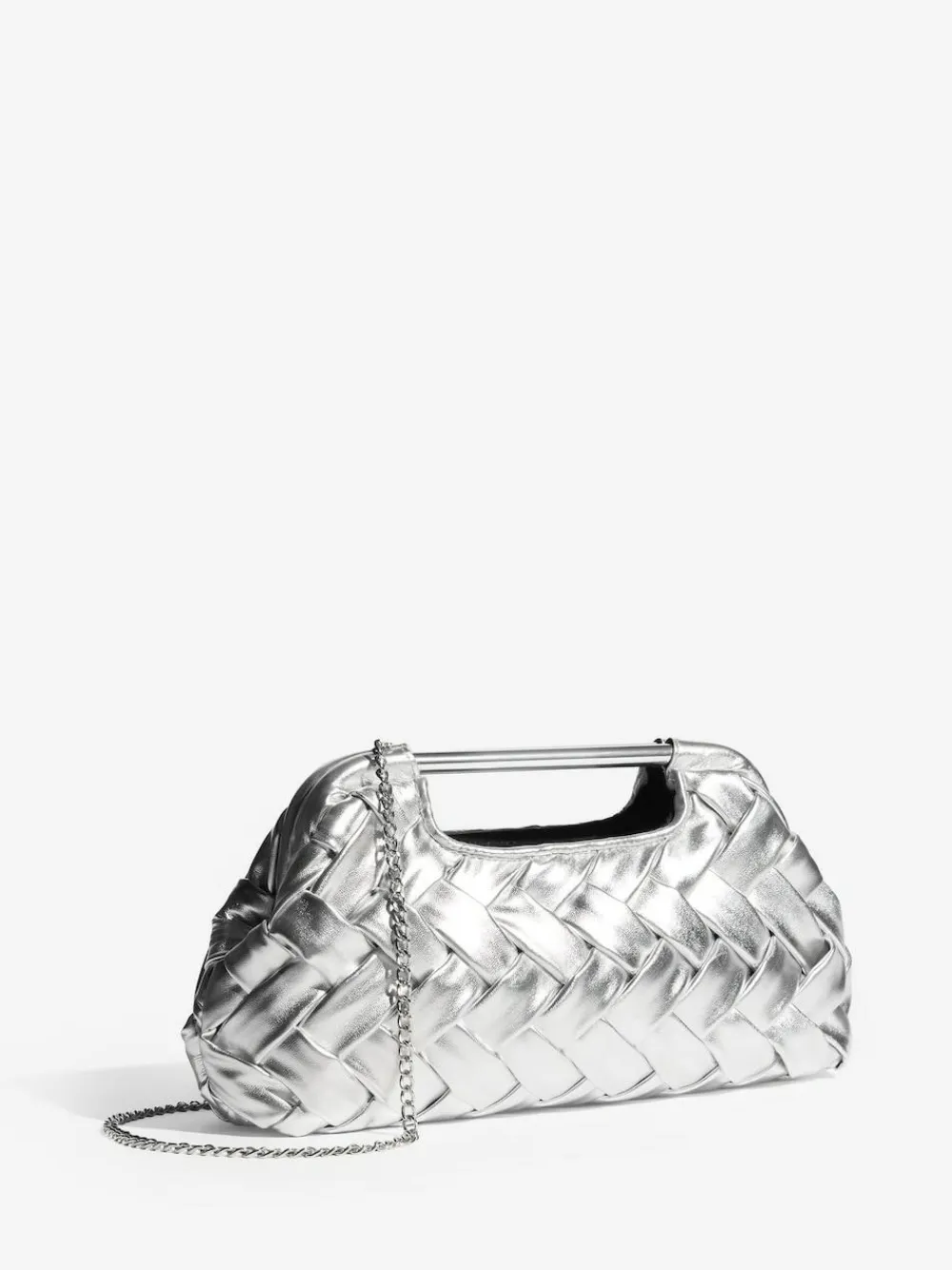 Make a metallic statement with this striking weave clutch bag. The soft, tactile weave material creates a sophisticated texture, while the polished silver grab handle adds a modern edge. Perfect for evening events, it includes a detachable chain strap for versatile shoulder or cross-body wear Weave material texture Polished grab handle Detachable chain strap Height 16cm Width 29cm Main 100% Polyester with PU coating. Lining 100% Polyester.