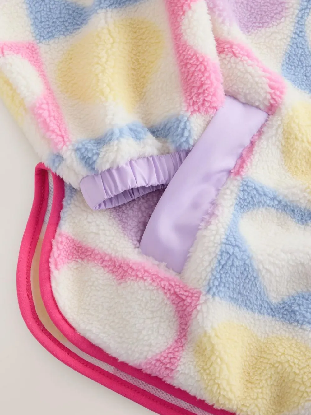 Wrapped up you and your little one in this pastel dream borg jacket – sprinkled with love, this cosy jacket is made for those who sparkle wherever they go. Its pastel heart pattern shines with playful charm, while the cotton-candy pink trim and lavender collar add a touch of magical flair. With cheerful pops of colour on the pockets, it’s perfect for keeping tiny treasures — from glittery hair clips to friendship bracelets! Whether she’s twirling through the park, giggling with friends, or chasing butterflies, this borg jacket is bound to keep her warm, cute, and full of joy. Main 100% Polyester. Trim 100% Recycled polyester.