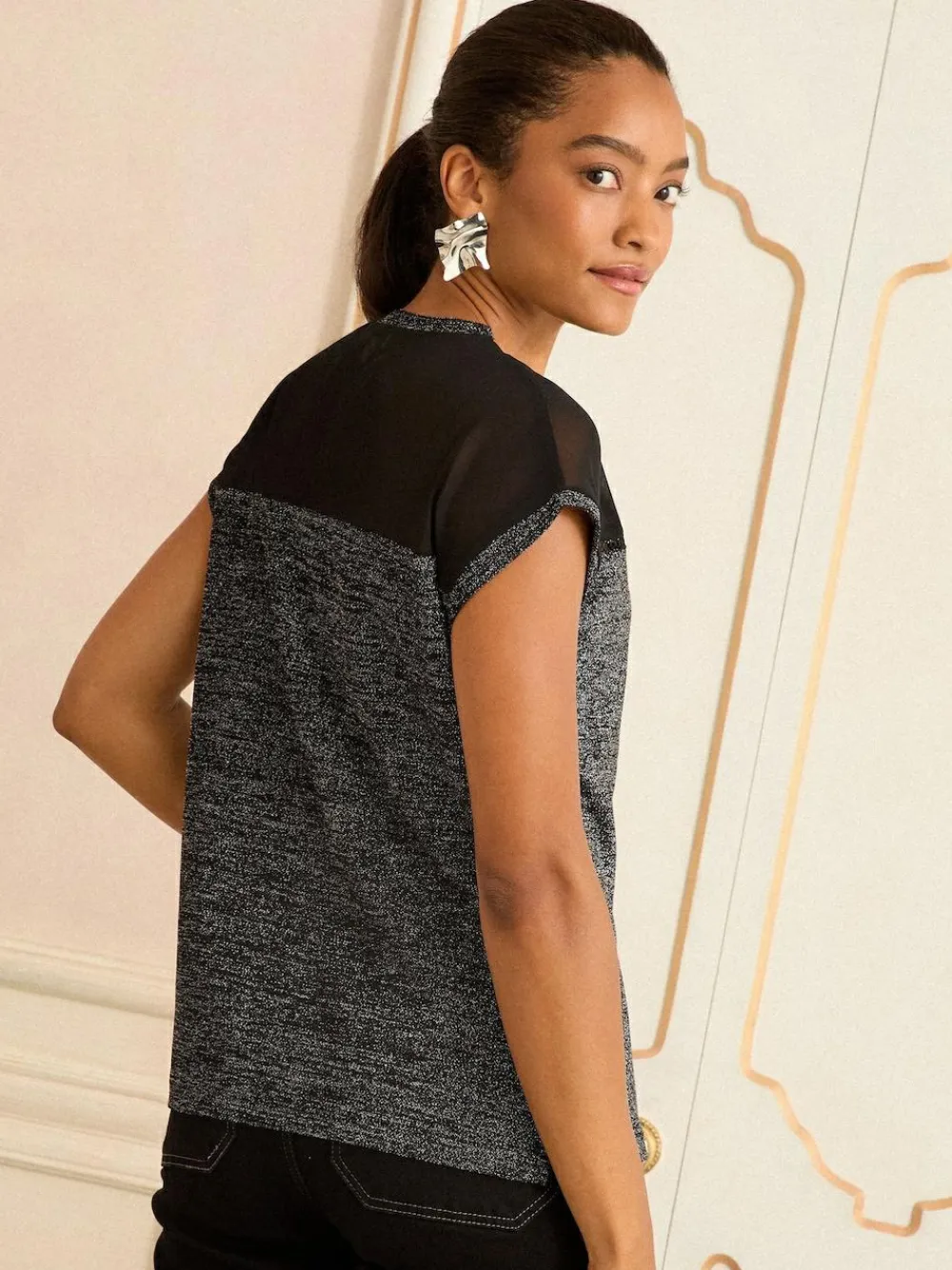 Love & Roses Black Metallic Satin Front V-Neck Short Sleeve Top