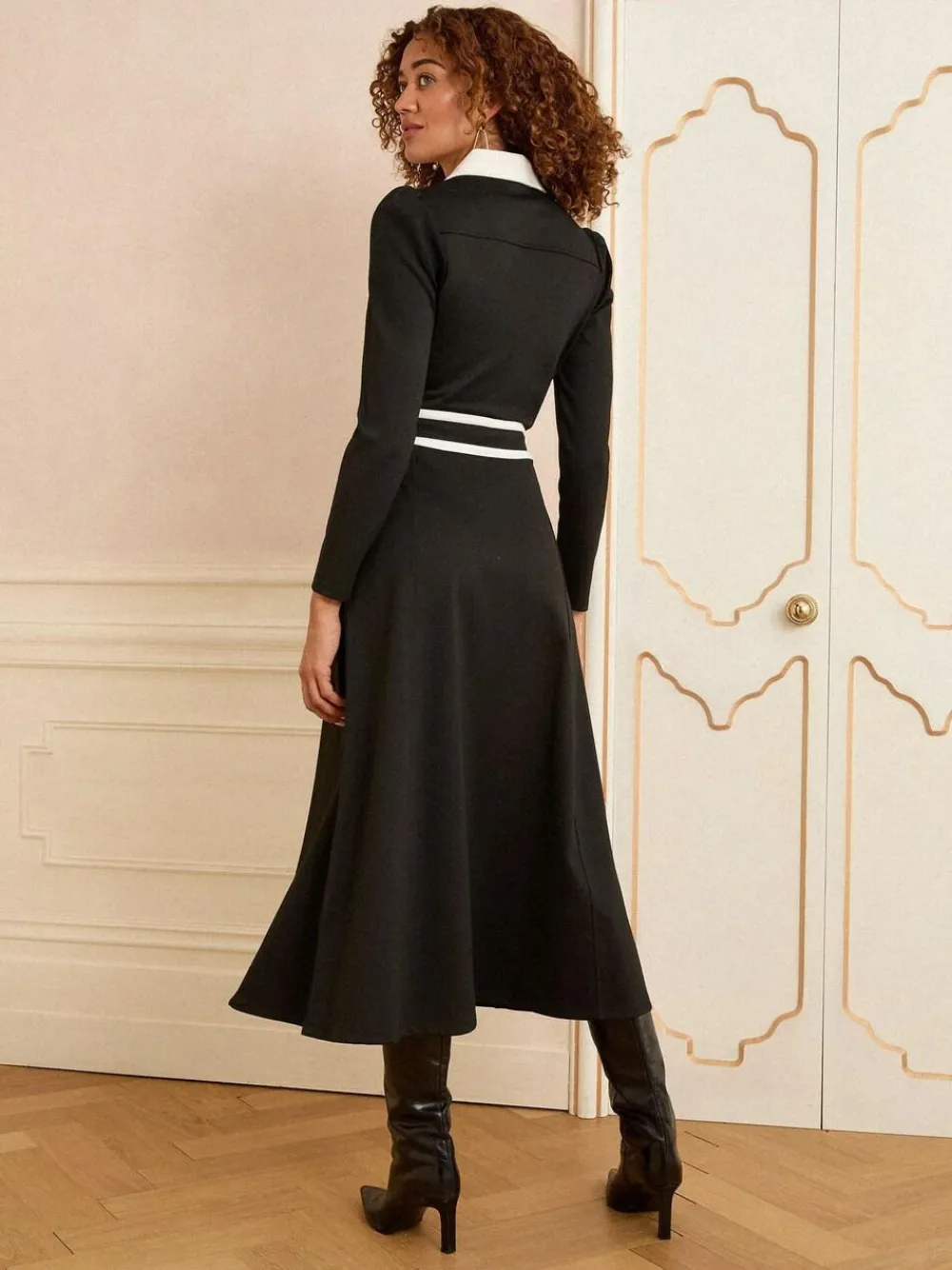 Love & Roses Ponte Contrast Trim Zip Front Long Sleeve Midi Dress Black