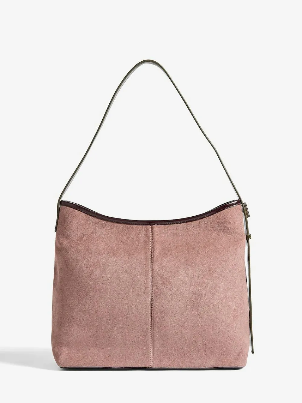Mixed Material Slouchy Tote Bag featuring: faux leather and faux suede material, slouchy shape, Love & Roses branding, adjustable strap. Perfect for work or school Height 30cm Width 34cm Depth 13.5cm Main 100% Polyester with PU coating. Outer 94% Polyester, 6% Elastane. Lining 100% Polyester.
