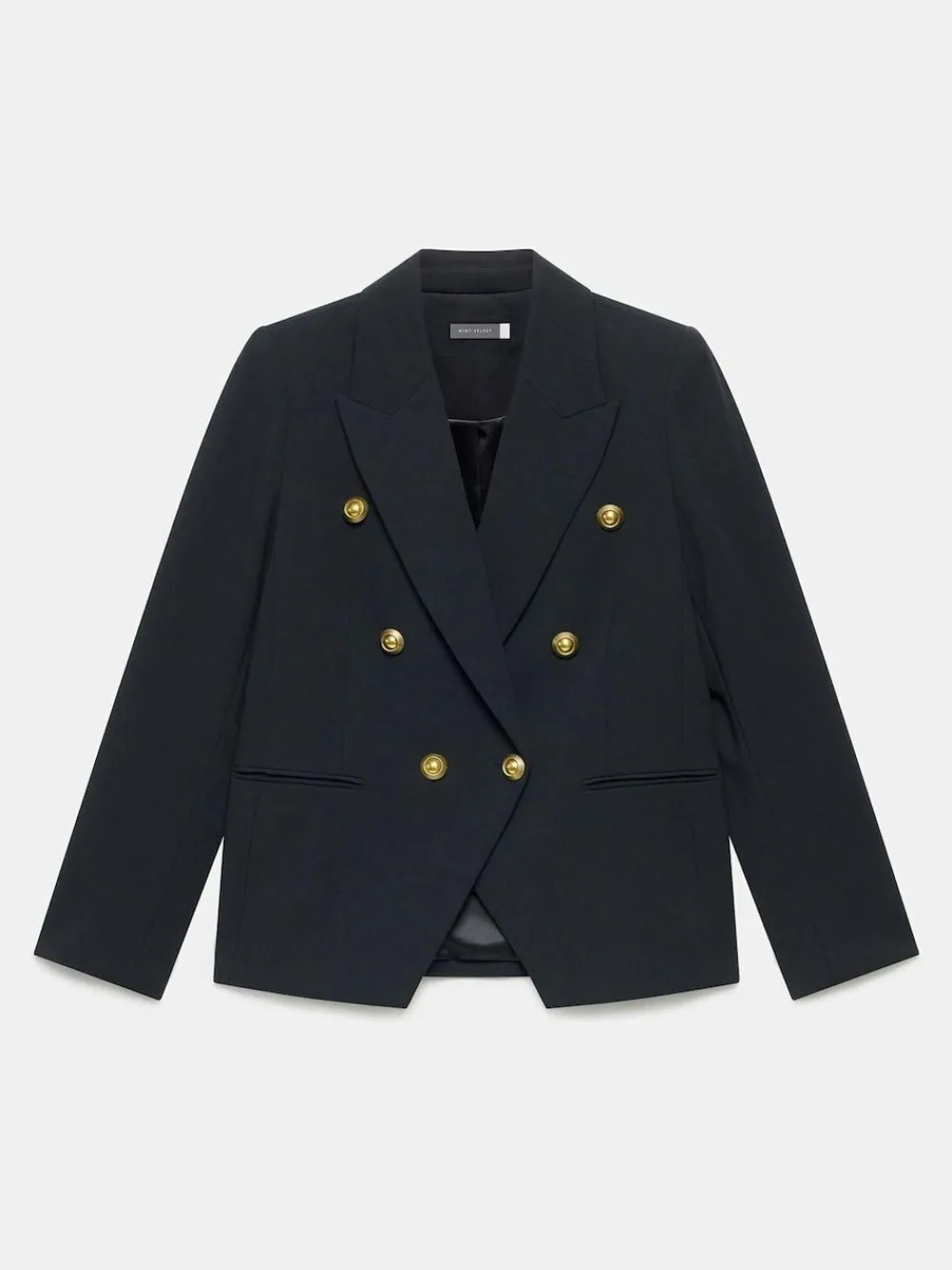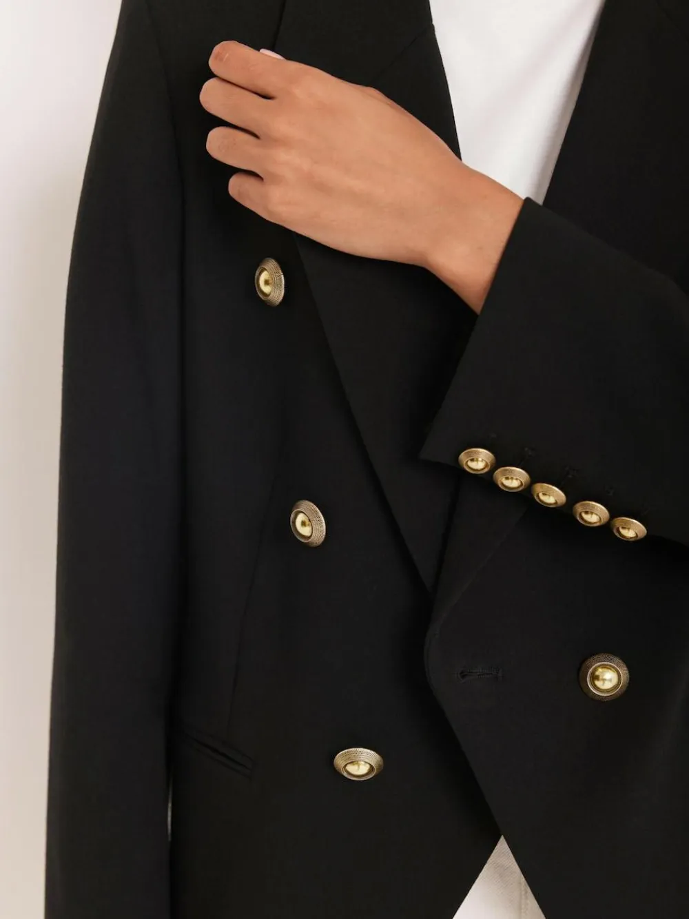 Black blazer in a double breasted silhouette with peaked lapels, long sleeves, buttoned cuffs, welt pockets, with gold-tone military-inspired buttons in a single fastening through the front. Fully lined. Dry clean only. Main 66% Polyester, 29% Viscose, 5% Elastane. Lining 95% Polyester, 5% Elastane.