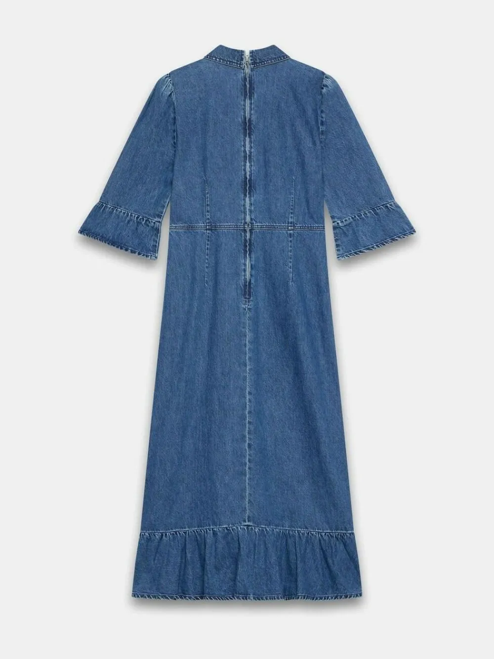 Indigo denim shirt dress in a midi silhouette with a classic collar, 3/4 fluted sleeves, chest pockets, ruffle hemline, featuring button fastenings through the front and a zip fastening through the back. Machine washable. 100% Cotton.