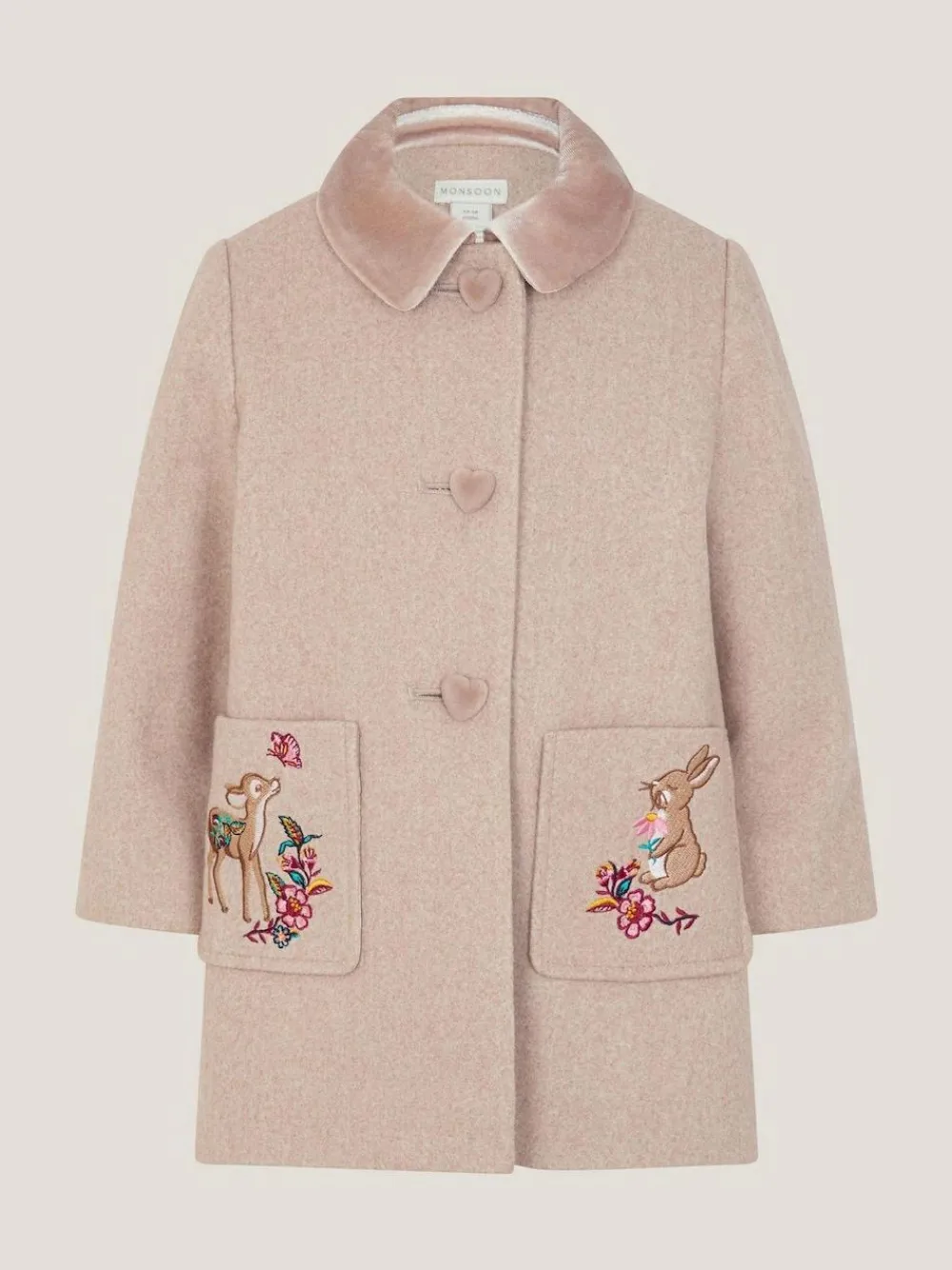 Look, it’s Bambi and Thumper! Keeping them cute and cosy in style, this coat is designed with a velvety soft collar and heart-shaped buttons to match. Our favourite part? The sweet woodland creatures and flowers embroidered on the pockets. Machine washable. Main 100% Polyester. Shell 100% Polyester.
