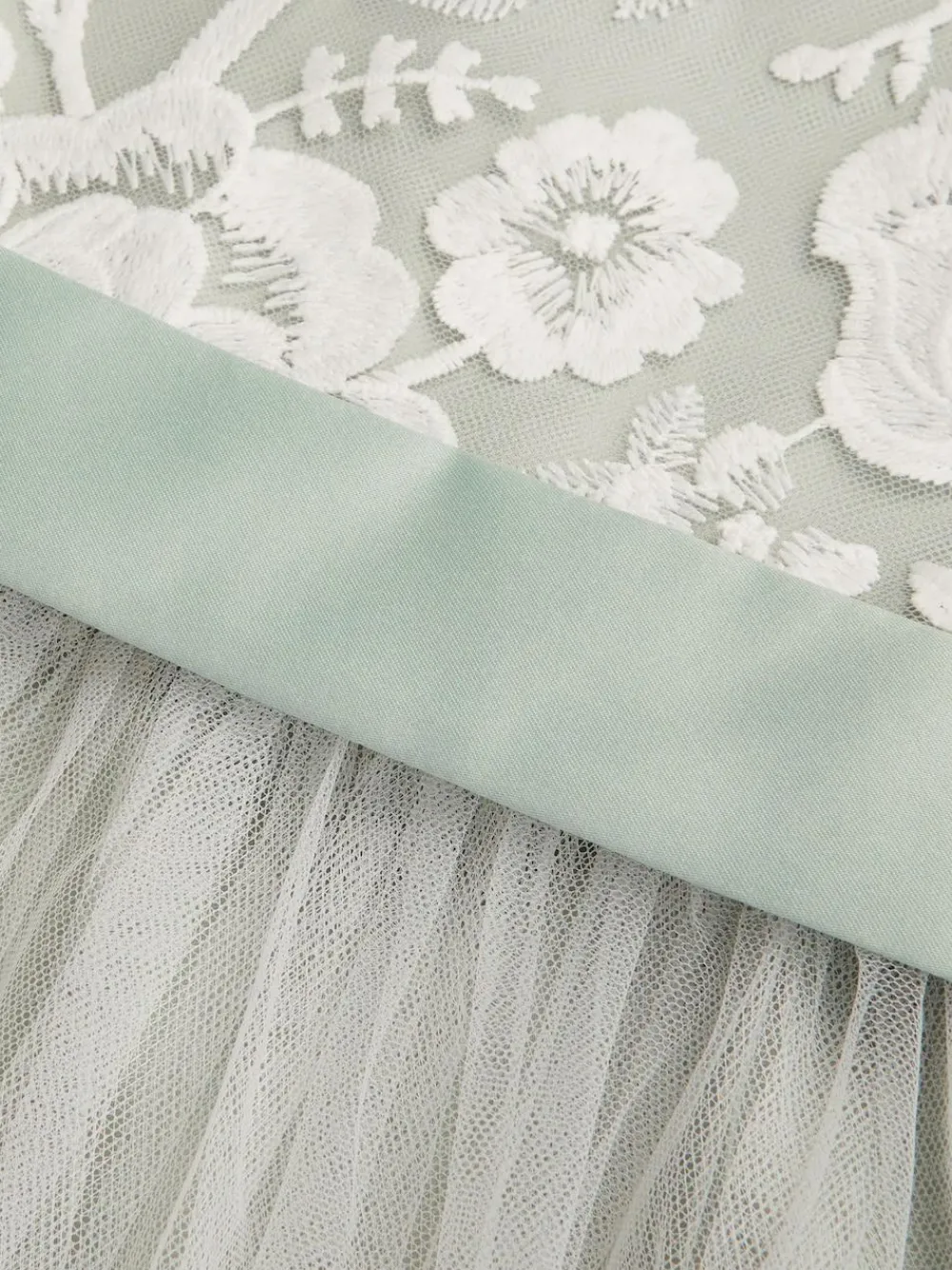 Like butter wouldn’t melt. For the little ones who love to dress up, this regal style features sage tulle topped with floral embroidery. Cut in a sleeveless silhouette, it’s fully-lined for comfort. Machine washable. Main 100% Polyester. Lining 100% Polyester.