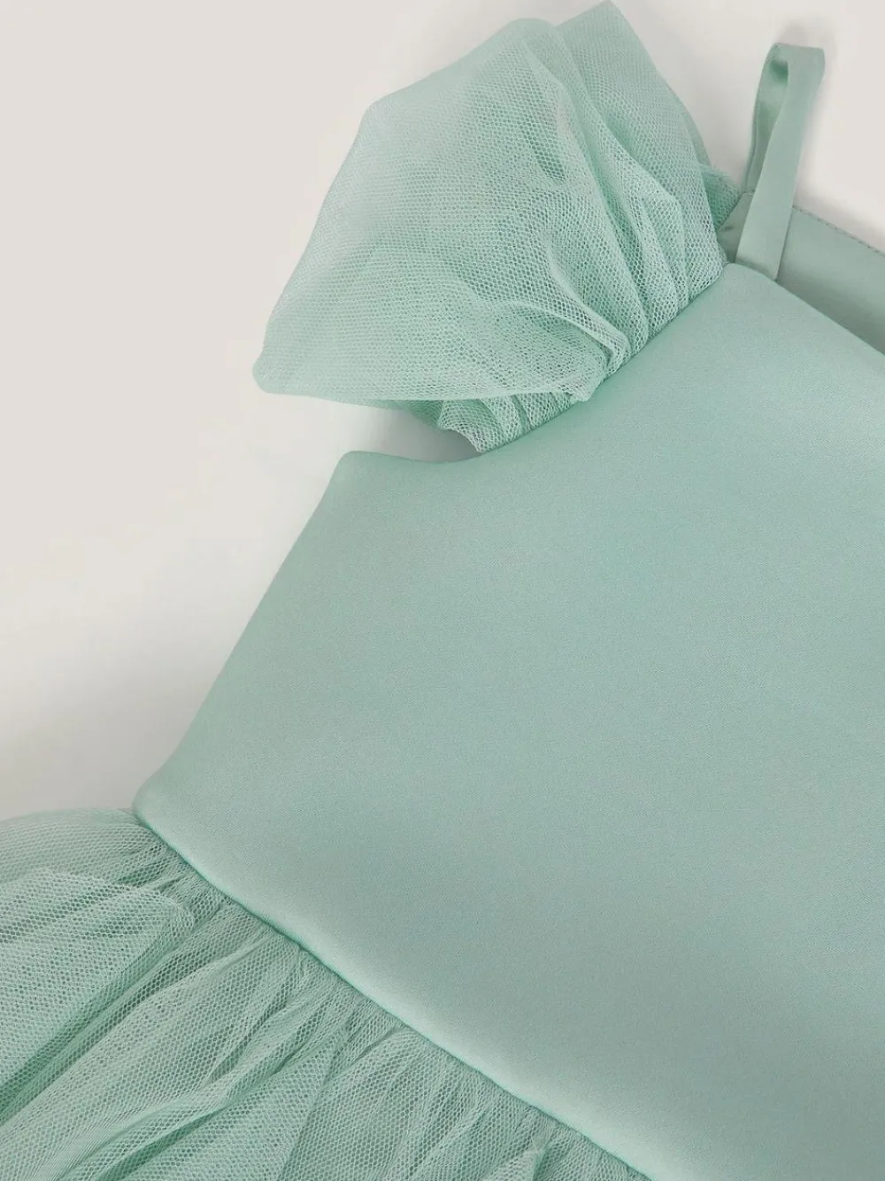 All they need are the glass slippers. Put together with seafoam green tulle, this twirly dress features a smooth, stretchy bodice and ruched off-the-shoulder sleeves. Whether they’re attending a wedding, communion or christening, they’re sure to feel like a princess. Machine washable. Outer 100% Polyester. Lining 100% Polyester.