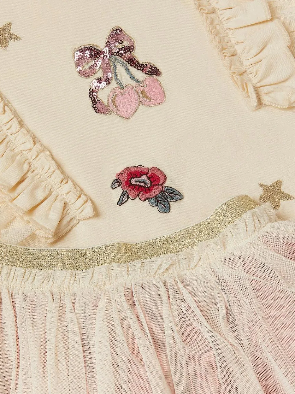 Dress for joy! A must-have addition to the outfit rotation for those who love daytime sparkles. Decorated with sequins and cute motifs of padlocks, keys, flowers, butterflies and stars, this set includes a long sleeve top and tulle disco skirt. Machine washable. Lining 100% Polyester. Skirt 100% Polyester.