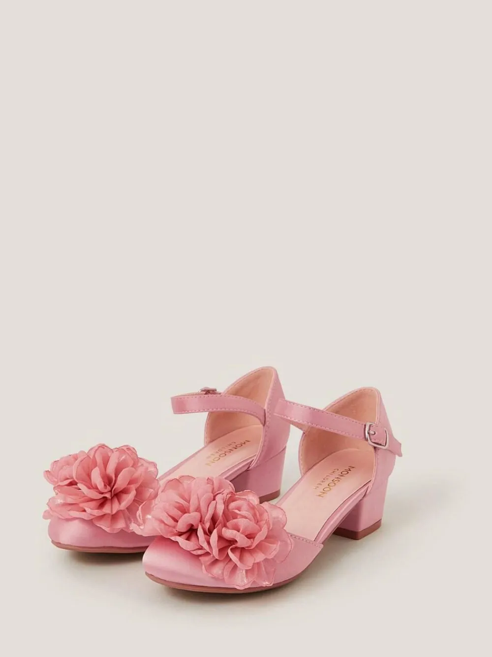 Pretty in pink. Coated in pink satin fabric, these two part heels are finished with a row of corsage flowers to the toe and a buckle strap fastening around the ankle. Main – 100% Textile. Lining – 100% PU. Sock – 100% PU.