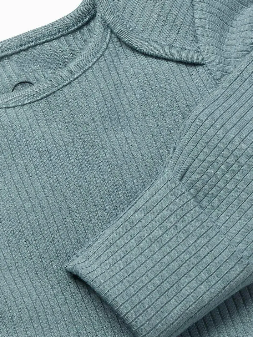 In our unique ribbed fabric, this breathable bodysuit is perfect for dressing your little one in every day. The baby bodysuit is designed with an envelope neckline for easy dressing and features poppers on the crotch to make changes a little simpler. Envelope neck opening for easy dressing. Fold over scratch mitts up to 6m. Machine washable. 67% Viscose, 28% Cotton, 5% Elastane.