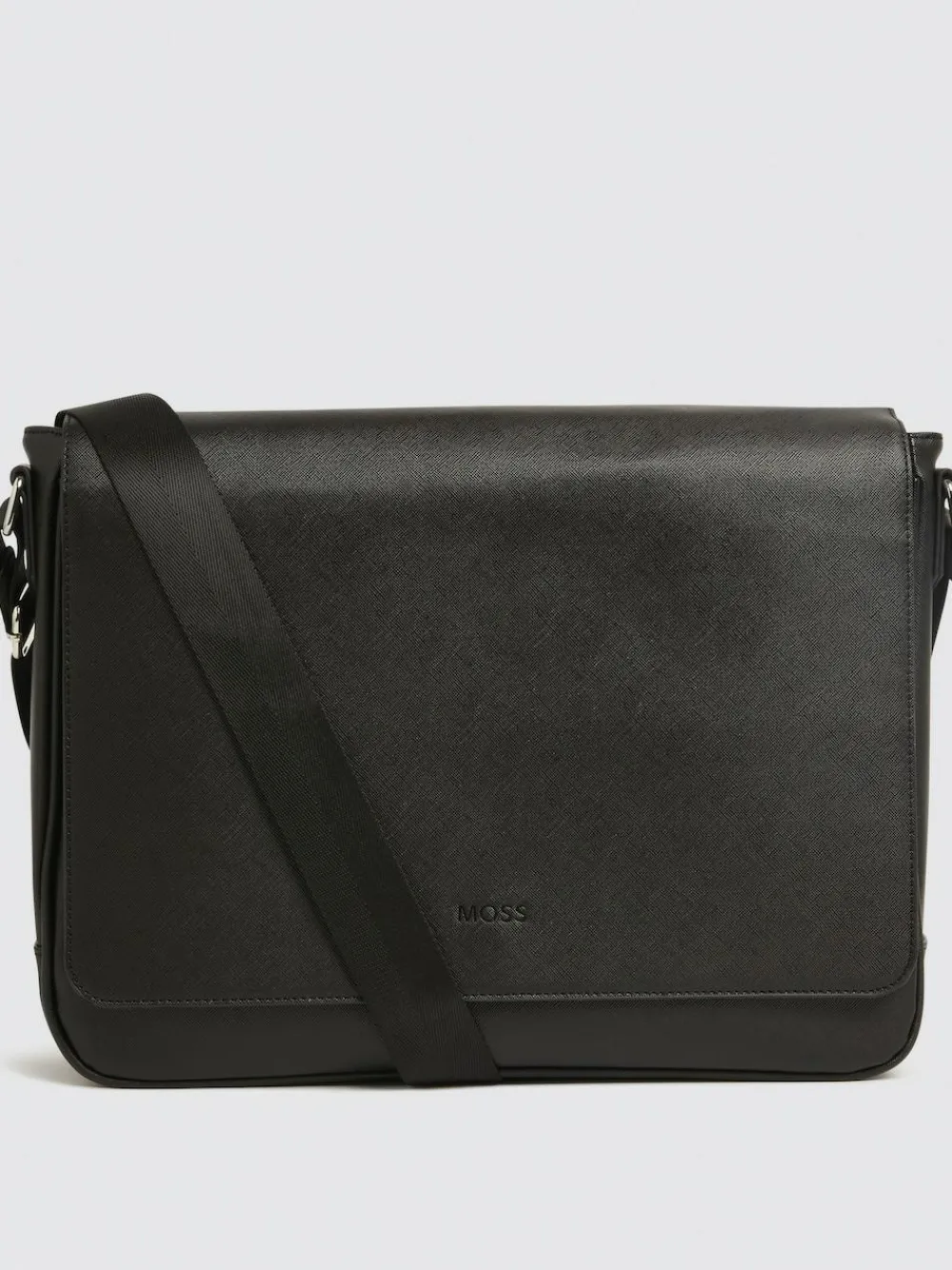 Crafted in black faux leather with a Saffiano-style structure, this dispatch bag is great for storing office documents, laptops, tablets and the like. The strap is adjustable so you can achieve a drop that works for you, while the front flap is stamped with a subtle Moss logo. 100% Polyurethane.