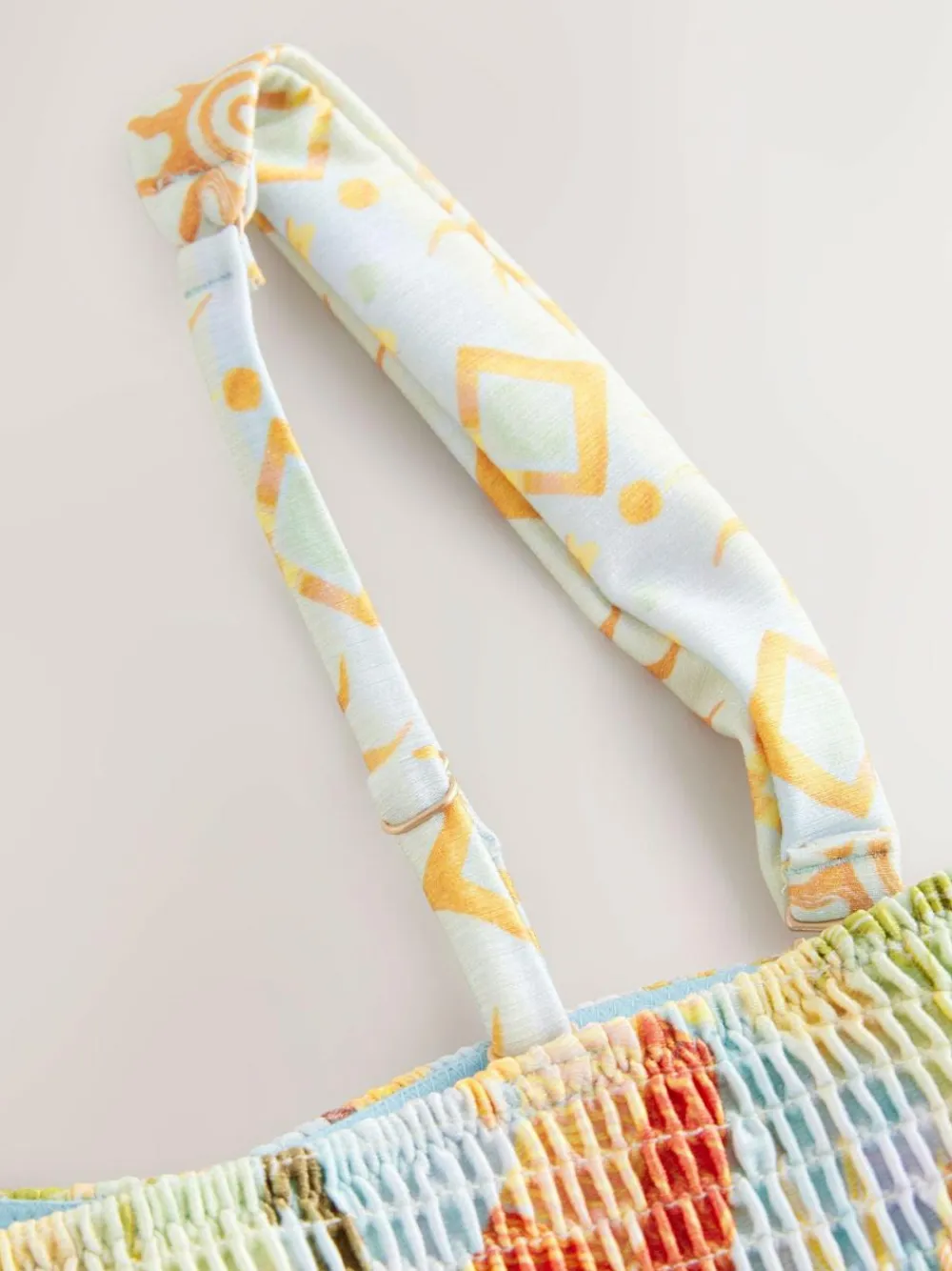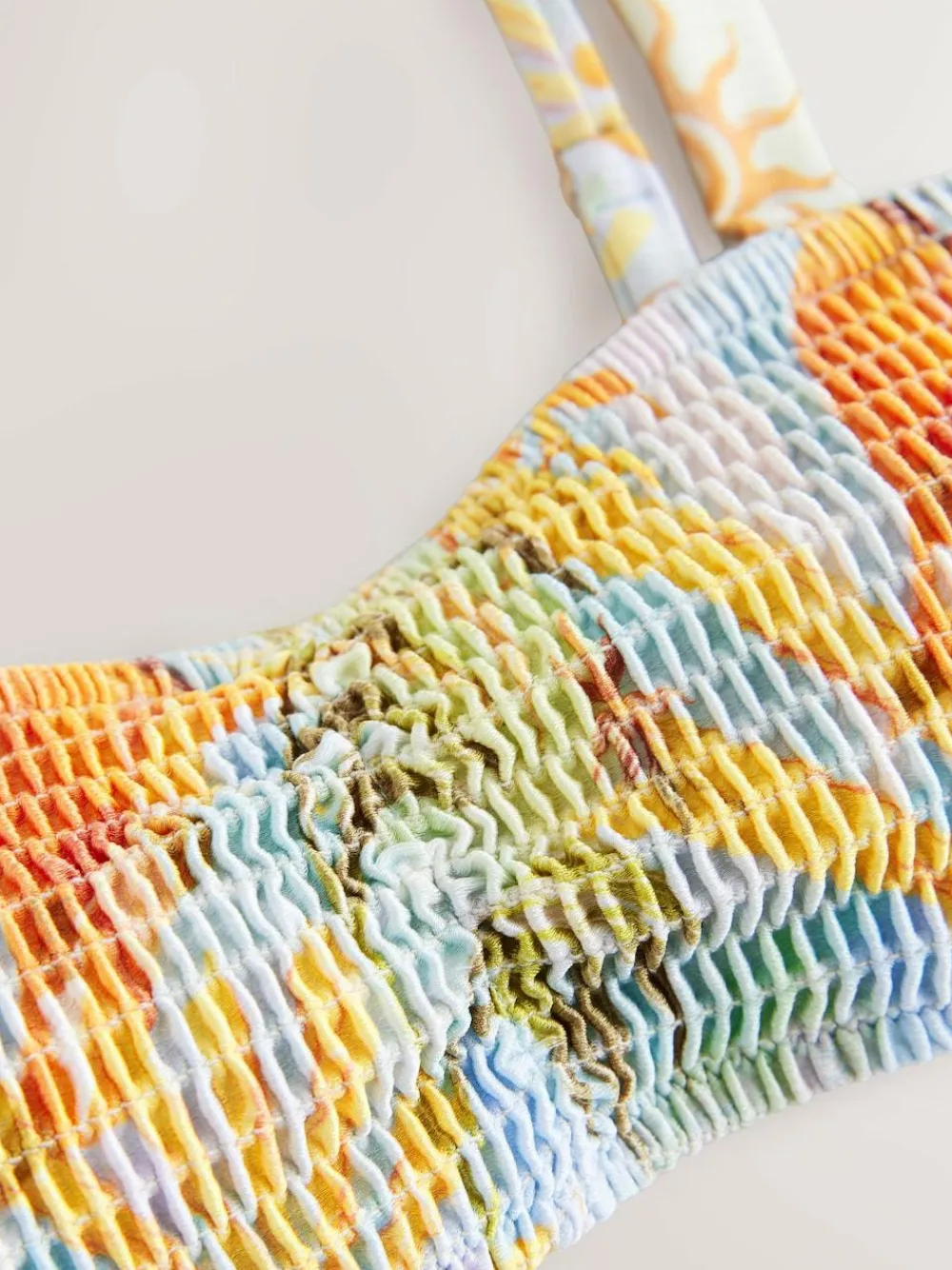 Make a colourful splash with the blue sun bikini top from Never Fully Dressed. Crafted with a stunning sun-inspired print, this bikini top effortlessly blends style with a vibrant flair. Designed in a bandeau style with removeable straps, this top features shirred detailing for comfy an flattering fit. Whether you’re lounging poolside or at the beach, this swimsuit is needed for your summer selection. Nylon rich blend Bandeau style Removeable straps Shirred detailing Matching bikini bottoms available Machine washable. Main 86% Nylon, 14% Elastane. Lining 92% Recycled polyester, 8% Elastane.