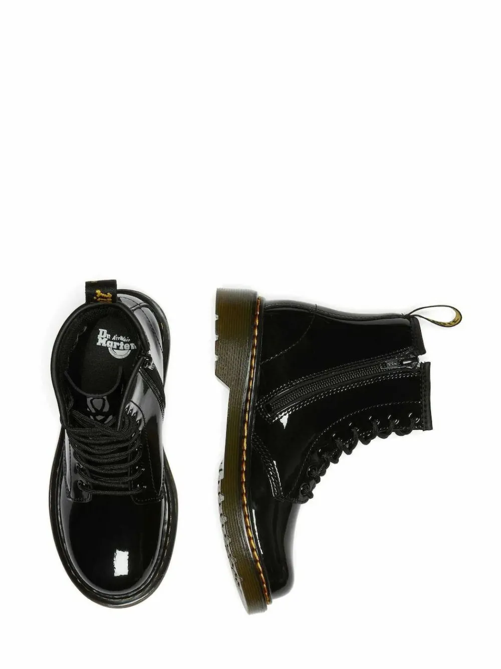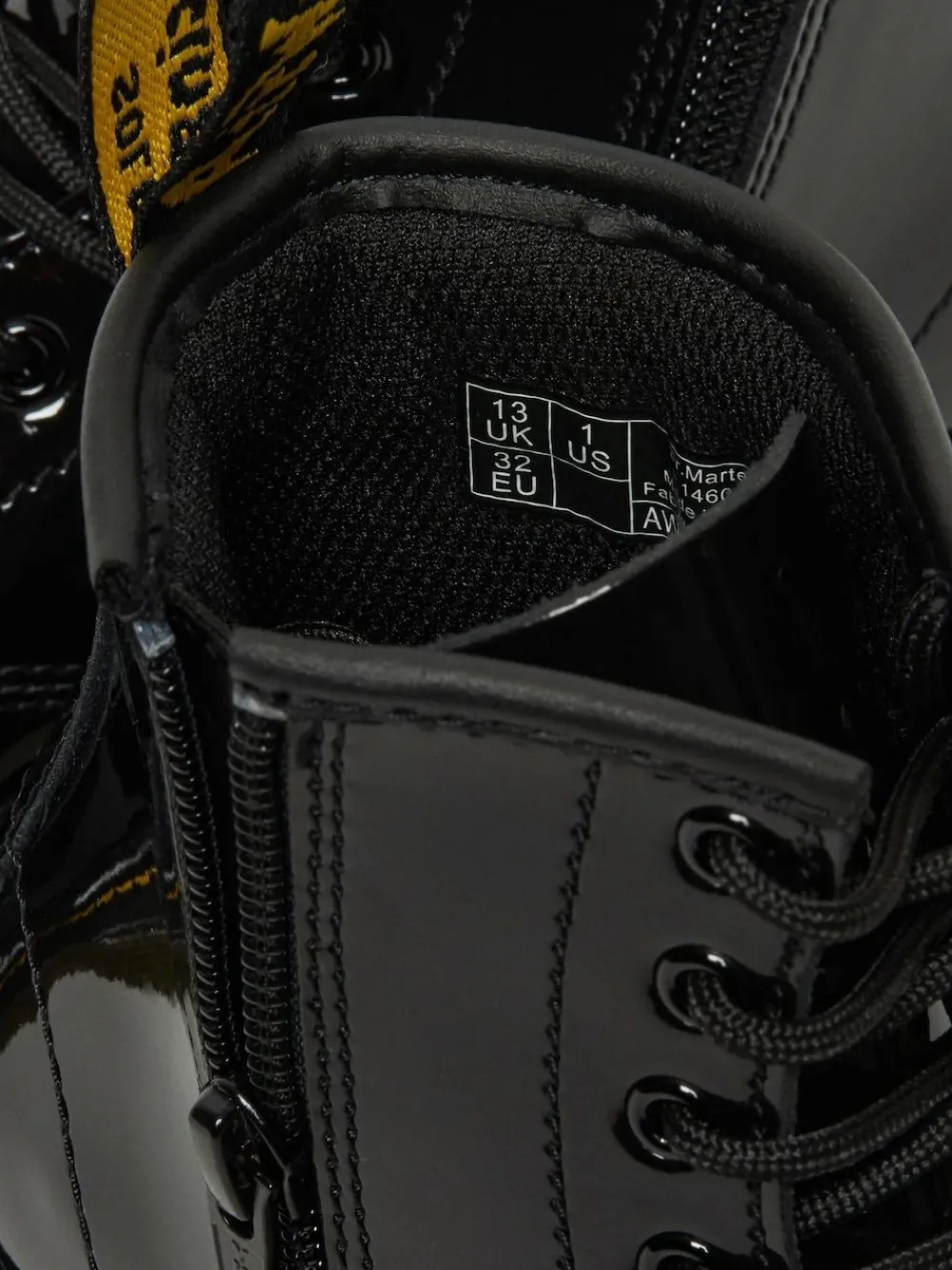 Small soles. Big attitude. Scaling down our Original silhouette, we’ve crafted mini versions of our 1460 boots for up-and-coming renegades. Built from a soft Patent Lamper leather and sitting on a comfortable, flexible sole, the boots are perfect for growing feet that don’t keep still. Finished with yellow stitching and a black and yellow heel loop. Born on 01.04.60. Named the 1460. Over six decades, our 8-eye work boot has become iconic. Patent Lamper is a fine-grained leather, coated to give a high-shine, glossy finish. Clean with a damp cloth and restore its shine with Dr. Martens Patent Cleaner. Main – 100% Leather. Lining – 60% Leather, 40% Textile. Sock – 100% PVC.