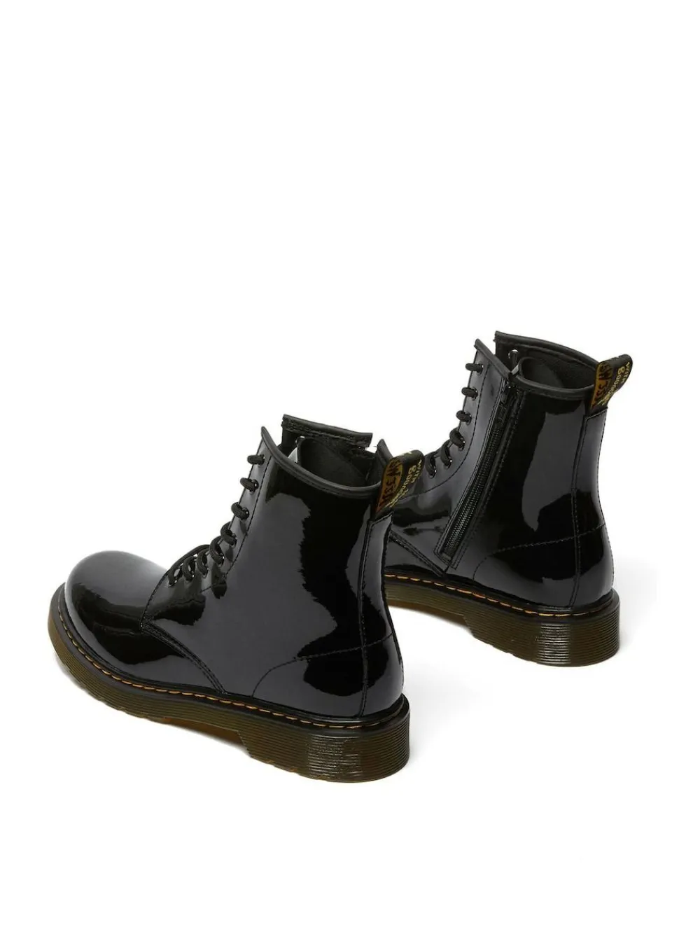 Small soles. Big attitude. Scaling down our Original silhouette, we’ve crafted mini versions of our 1460 boots for up-and-coming renegades. Built from a soft. Patent. Lamper leather and sitting on a comfortable, flexible sole, the boots are perfect for growing feet that don’t keep still. Finished with yellow stitching and a black and yellow heel loop. Main – 100% Leather. Lining – 60% Leather, 40% Textile. Sock – 100% PVC.
