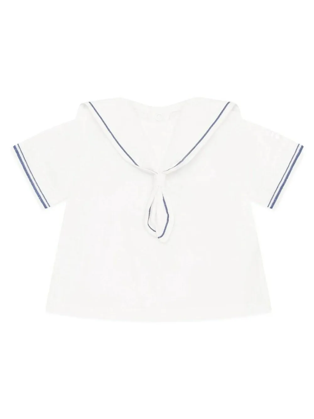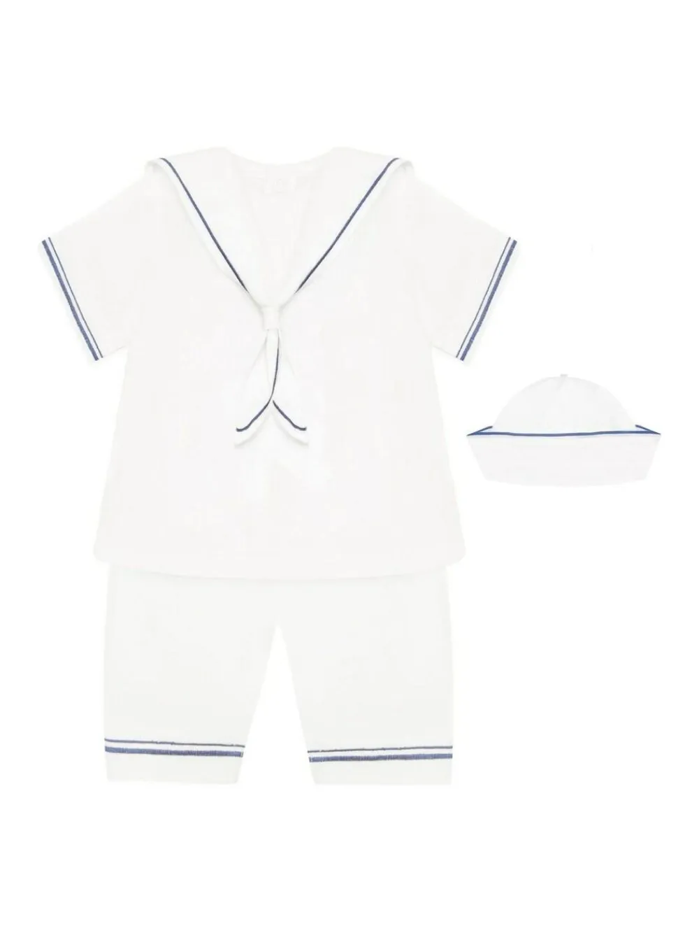 This nautical themed, linen style, two-piece baby boy’s outfit in navy and white is perfect for your little sailor! Featuring embroidered navy stitching on the traditional sailor’s knotted collar, and short sleeve cuffs, the effect is quite striking. The shorts have a softly elasticated waistband with navy stitched turn-ups. The outfit is completed by a matching sailor hat, with embroidered turned up brim. Machine washable. 100% Cotton.