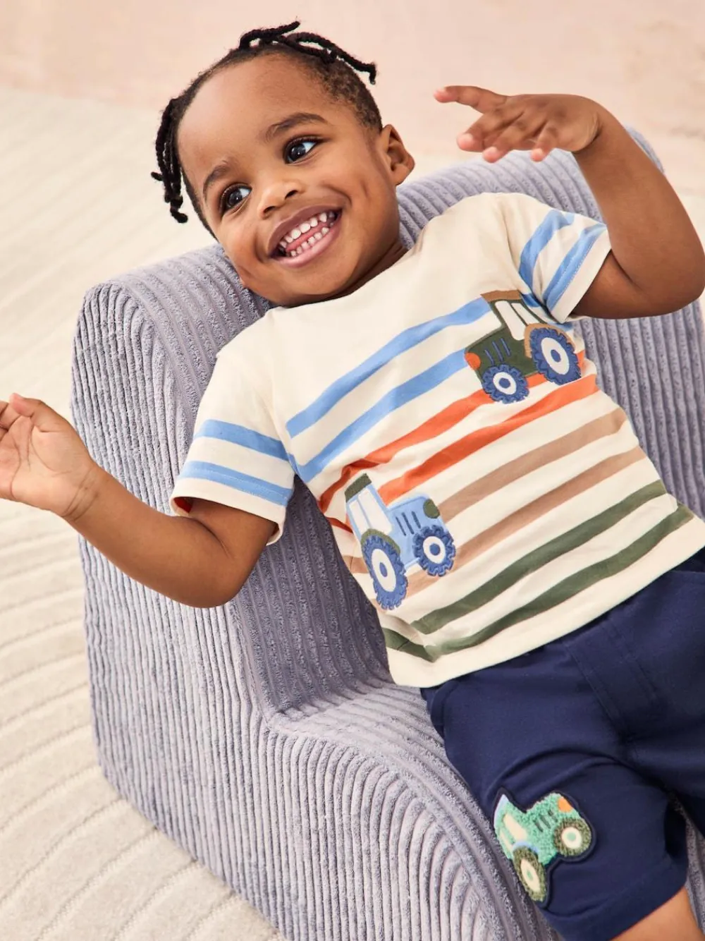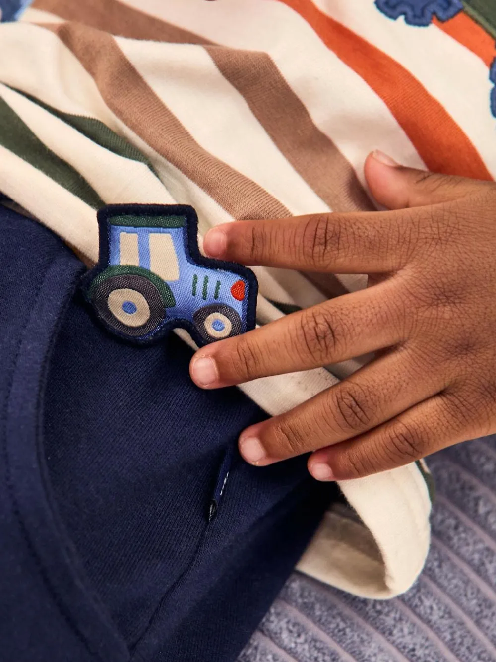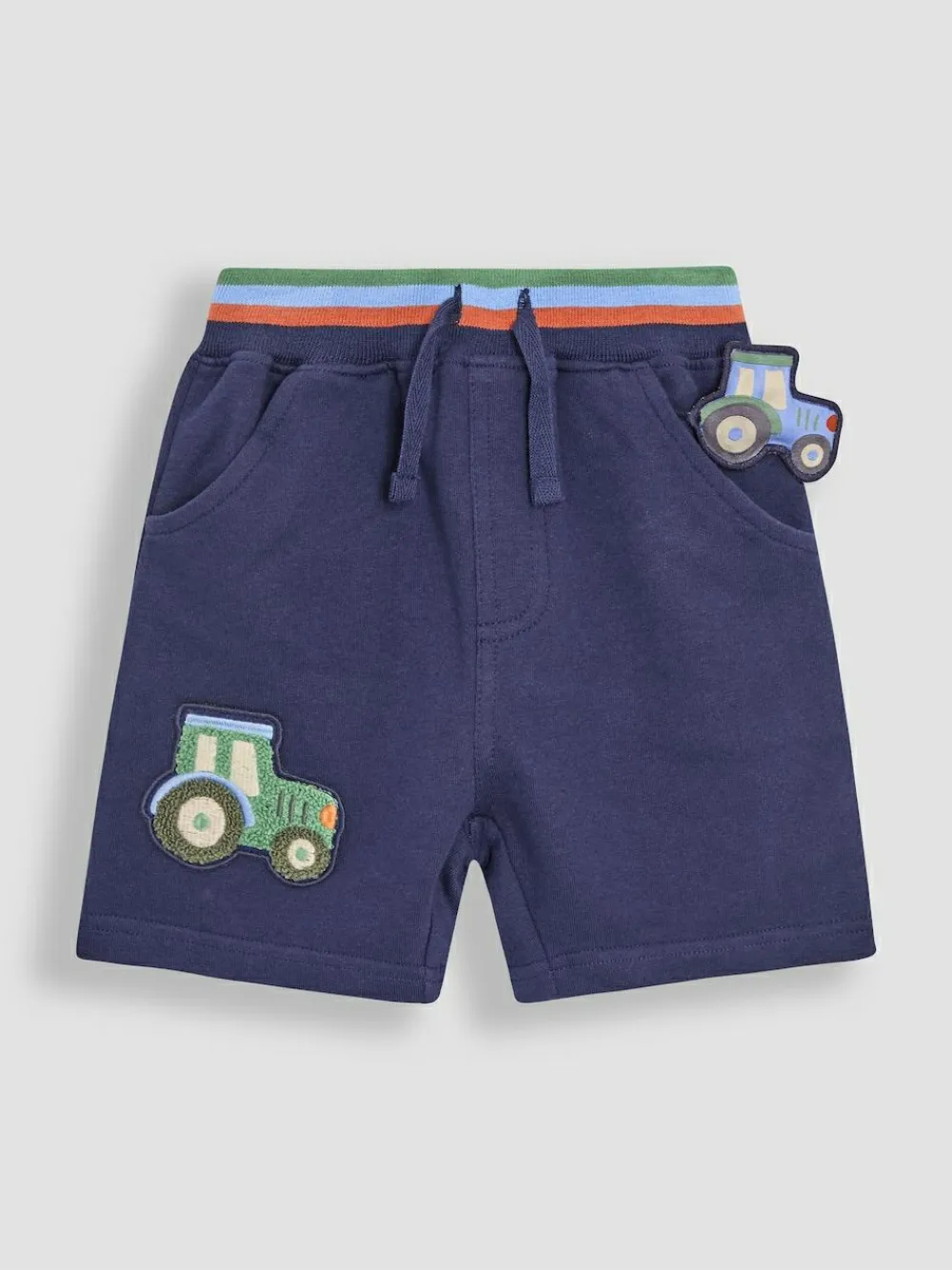 Tumble, rumble and roll into sunny days with these Tractor Appliqué Jogger Shorts. Let your little explorer stay comfy with the super fun rainbow coloured elasticised waistband. The stylish bits don’t stop there, the playful Tractor appliqué design makes this piece play-date perfect. Navy shorts Elastic drawstring waistband Two side pockets Tractor pet in pocket Tractor appliqué Machine washable 100% Cotton.