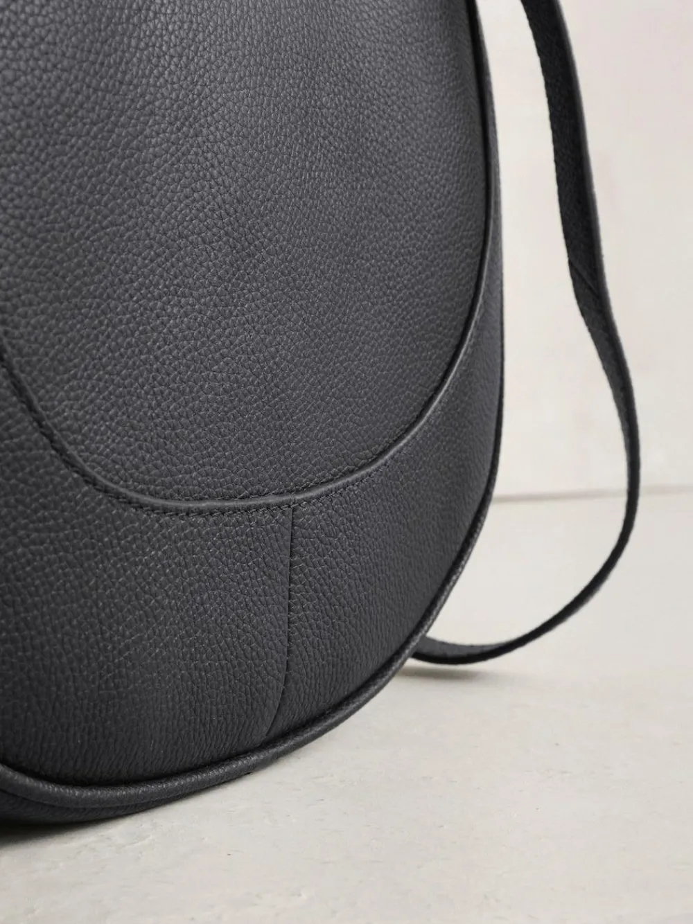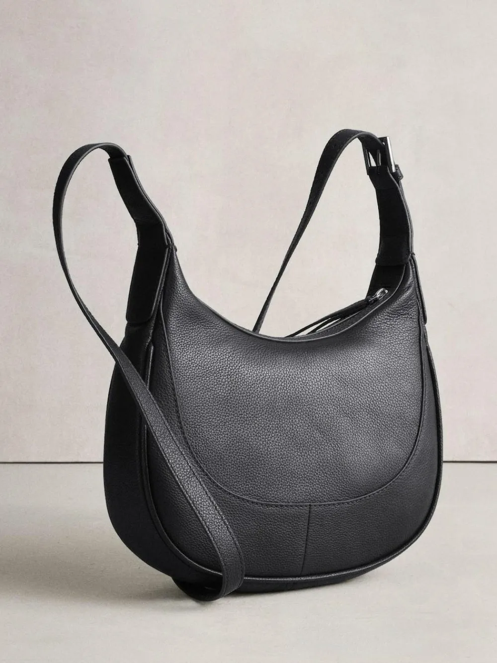 Meet your new essential, the Black Leather Scoop Cross-Body Bag. Crafted from luxurious leather material in a chic, curved shape, it offers effortless style and practicality. With a secure zip fastening and a comfortable adjustable strap for versatile wear, this bag is perfect for chic everyday use and day-to-night adventures. Leather material Adjustable strap Zip fastening Cross-body style Height 25cm Width 27cm Depth 6cm Outer 100% Leather. Lining 100% Recycled polyester.