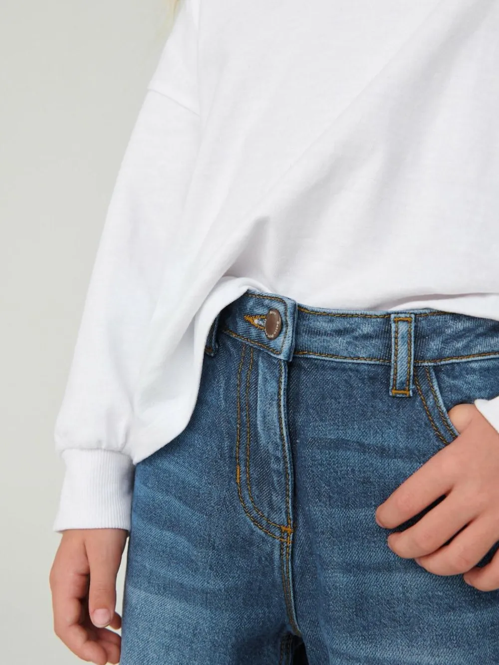 Wear them just like mama. In an on-trend mom shape, our mid blue denim jeans are made from a lightweight and comfortable cotton denim with an elasticated back waistband for fit and comfort. Style with a simple top and box fresh trainers for a cool finish. Standard Mom fit Straight leg Elasticated waistband Machine washable. 100% Cotton.