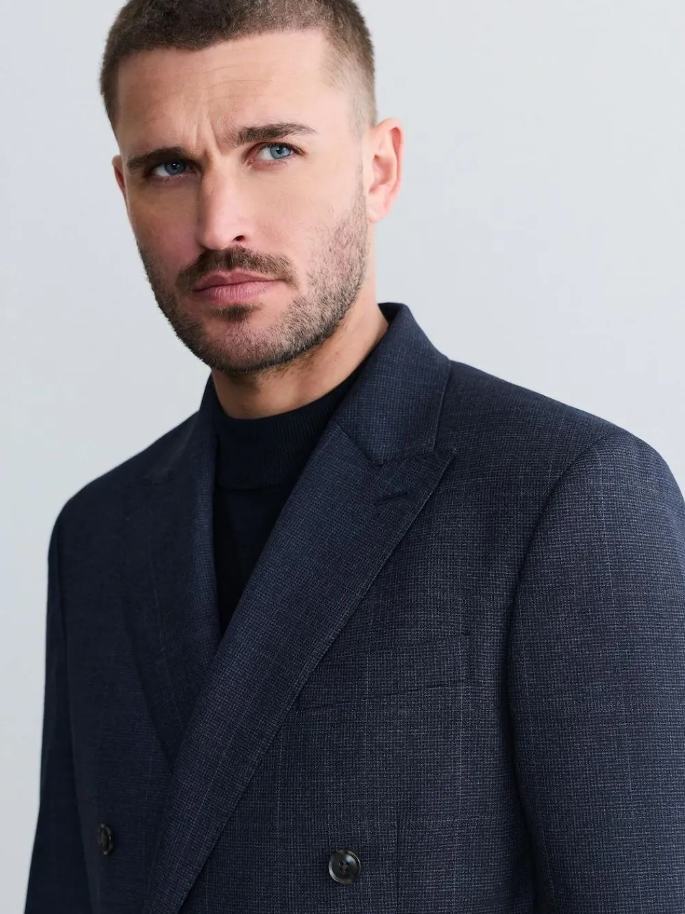 Experience classic Italian style with this double-breasted, navy suit jacket. Crafted from a luxurious Marzotto Italian check fabric, it offers a refined silhouette and sophisticated feel. The bespoke jacquard lining and functional cuffs add an exquisite touch, making this the perfect piece for any formal occasion. Marzotto Italian check fabric Bespoke jacquard lining Double-breasted Functional cuffs Long sleeve Regular fit Dry clean only Main 100% Wool. Lining 57% Polyester, 43% Viscose.