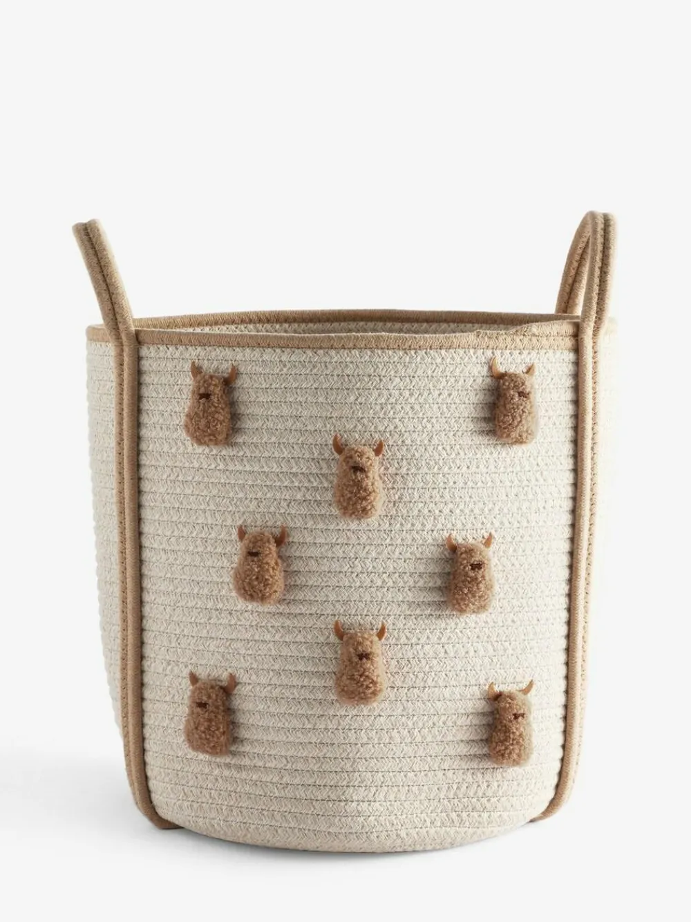 Bring a cosy, playful feel to any room with this natural cream woven basket, adorned with our very own Hamish the highland cow. Complete with robust handles, it’s ideal for tidying away toys, books, or blankets, bringing a playful personality to clutter control. Height 35cm Width 30cm Depth 30cm Do not wash. 100% Polyester.
