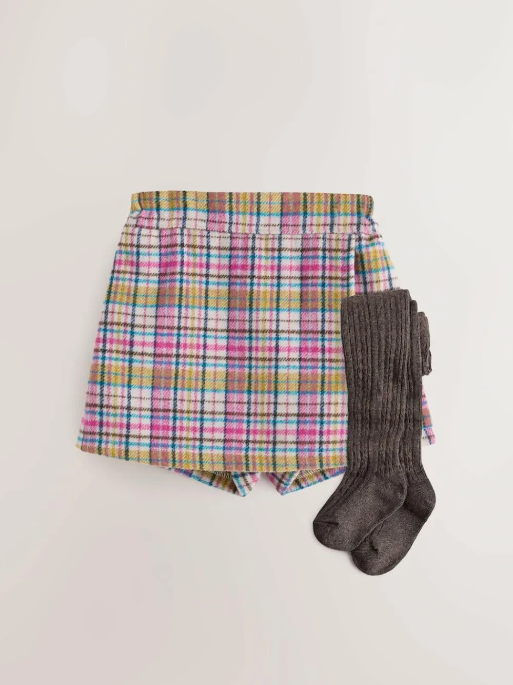 Perfect for a stylish and comfortable day out, this two-piece pink and mink check set is a charming addition to any wardrobe. The check-print pull-on skirt has an elasticated back waist for a comfortable fit, while the coordinating tights ensure a cosy finish. 2-piece set Pull-on skirt Tights Check print Back elasticated waist Skirt 84% Polyester, 13% Wool, 1% Acrylic, 1% Nylon, 1% Viscose. Tights 76% Cotton, 21% Nylon, 3% Elastane.