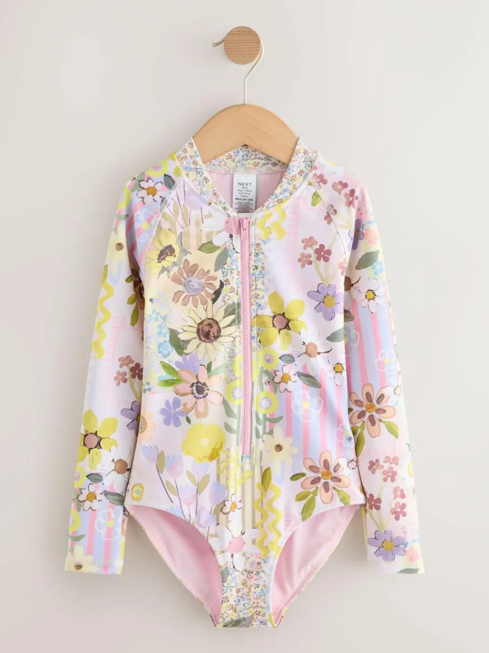 This all-in-one swimsuit provides extra coverage to help protect her from the sun, featuring a zip fastening to the front, long sleeves and a high collar. All-in-one Zip fastening Long sleeves High collar Machine washable. Main 82% Recycled polyester, 18% Elastane. Lining 92% Recycled polyester, 8% Elastane. This fabric will provide protection against solar ultraviolet radiation. It has been independently tested and given a UPF rating of 50+ which blocks more than 97.5% of UV rays. Important Advice: • Sun exposure causes skin damage • Only covered areas are protected • Always use a high protection factor sunscreen on any exposed areas of skin • The protection offered by this fabric may be reduced with use or if stretched or wet • Always rinse in fresh water after each use • Young children should be kept in the shade between 11 and 3 • Don’t forget your hat and sunglasses. • Fabric provides UVA +UVB protection from the sun.