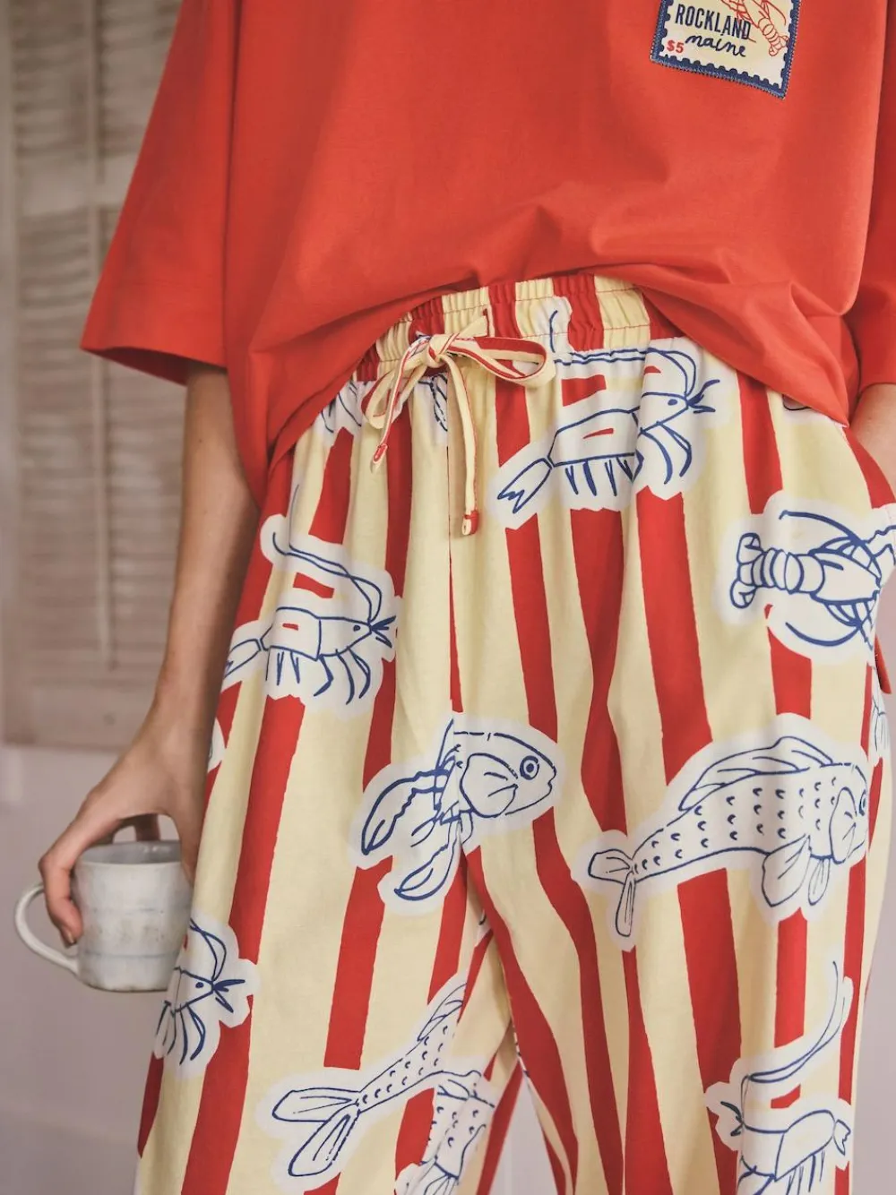 Settle in for a comfortable night with this super soft and comfy jersey pyjama set. The bright red short-sleeved top is complemented by wide leg bottoms featuring a fun stripe and fish print. This cheerful set is perfect for relaxed lounging and cosy bedtime wear. Short sleeve top Wide leg pyjama bottoms Super soft jersey fabric Crew neck Stripe and fish print Drawstring waist Comfortable loungewear Machine washable. Pyjama Top Top 100% Cotton. Neck 95% Cotton, 5% Elastane. Pyjama Bottom 100% Cotton. Warning: Keep away from fire and flames., Our tall collection is designed to fit women 5’10” and above. This has been proportionally increased through the body, leg and sleeve to achieve the perfect fit. Available in sizes 8-20.