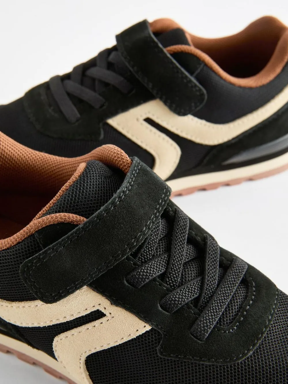 They’ll be reaching for these black retro-look trainers time and again, with their stylish leather and suede panelled upper, easy elasticated laces and a touch fastened strap for a secure fit, finished with a textile lining and a sporty outsole. Regular fit Leather and suede upper Elasticated laces Touch-fastened strap Textile lining Sporty outsole Upper – Leather, Textile, Lining & Sock – Textile, Sole – Other Materials.