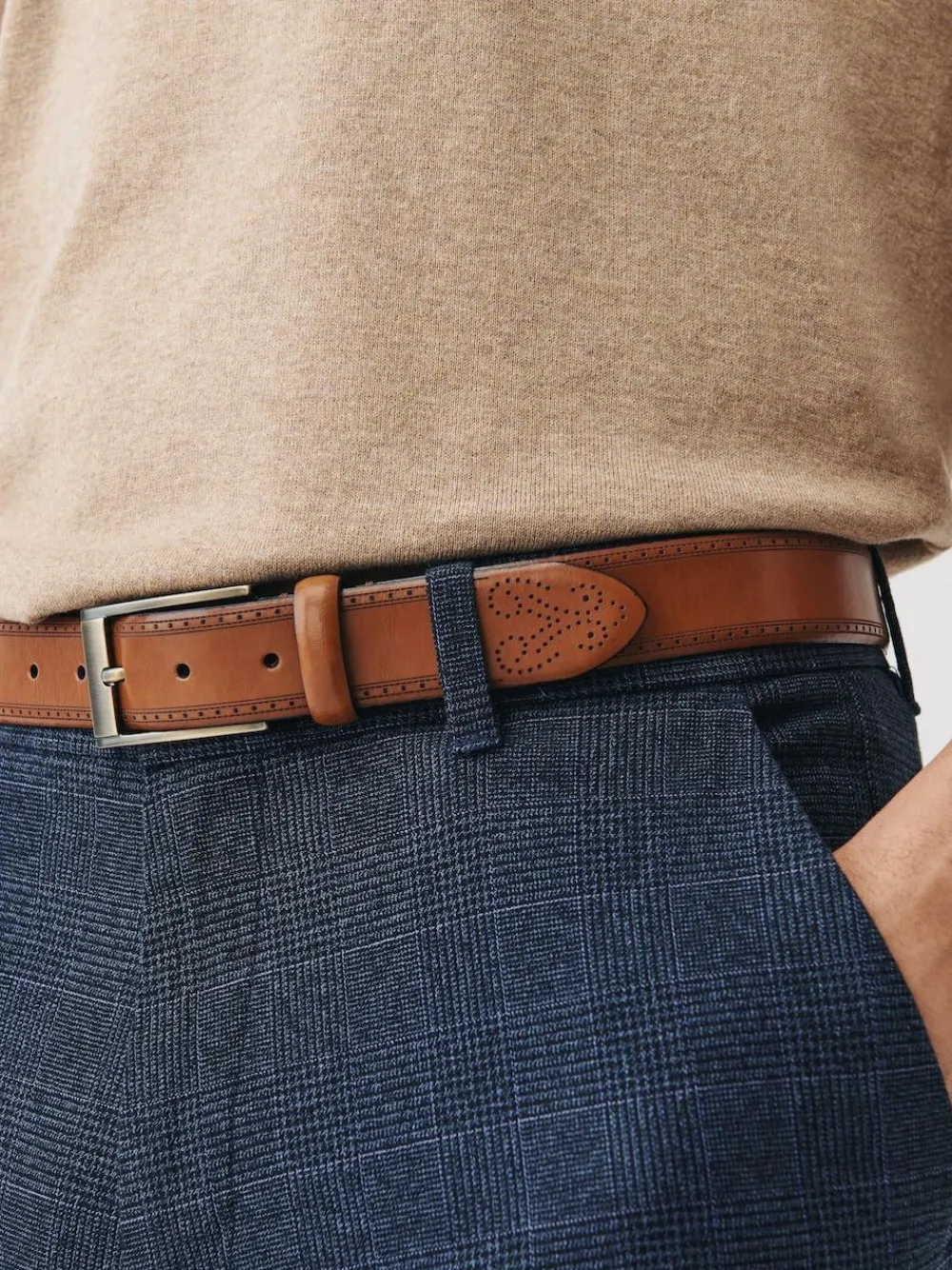 Sizing update: To find the right size for you, refer to our helpful size guide. This casualwear essential has a premium design, crafted from smooth leather with stylish brogue-inspired perforated detailing, an adjustable brushed brass buckle and a leather keeper strap. 100% Leather 3.2cm(approx) width Brushed Brass buckle Brogue detail Leather keeper It comes in tan brown 100% Leather.