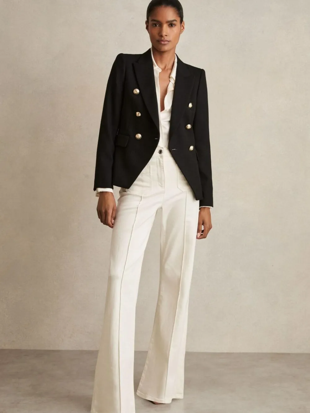 The black Tally double-breasted blazer has a tailored fit that sculpts the waist and defines the shoulders. It’s wool blend fabric has a textured hand-feel which adds interest to both casual and smart edits. Wool blend Textured Double-breasted Gold-tone buttons Vent to reverse Lined Tailored fit The model is wearing a size 8. Measurements of model: Height 5ft 10” / 177.8cm. Regular centre back neck to hem 26″ / 66cm. Dry clean only. 50% Wool, 50% Polyester.