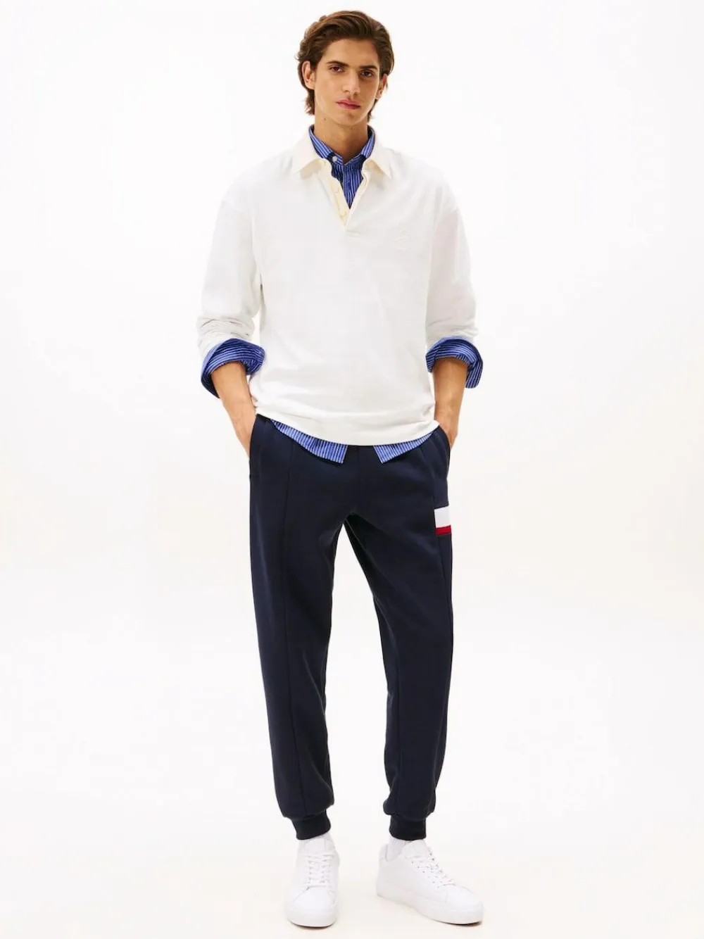 These joggers are made from cotton-blend flex fleece with colour-blocked detailing, making them a cosy and on-trend choice for lounging. Highlights: Cotton blend flex fleece Elasticated drawstring waist and cuffs One back welt pocket Signature colour-blocked design on leg Tommy Hilfiger branding Tommy Hilfiger flag embroidery on the back Shape & fit. Regular fit Cuffed leg Our model is 1.86m and wears size M. Machine washable. 64% Cotton, 36% Polyester.