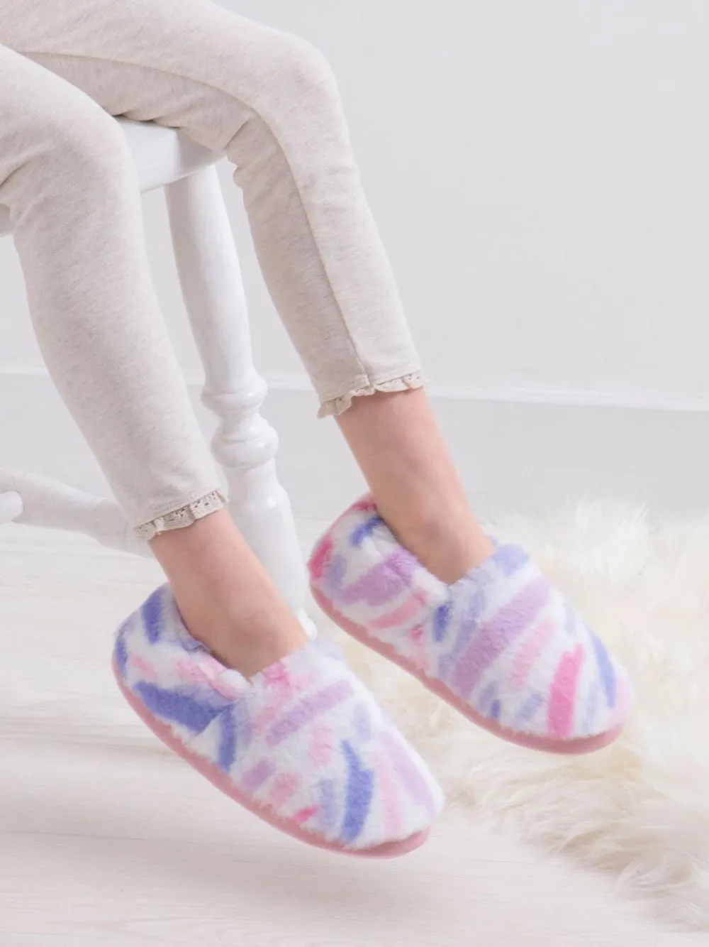 Grown up slippers for your little ones; lovely splashes of soft pink, blue and lilac decorate these full back slippers with a durable sole and gorgeously warm fleece lining. Co-ordinate with their winter cosies for a snuggled up winter season. Upper – Textile, Lining and Sock – Textile, Sole – Other Materials.