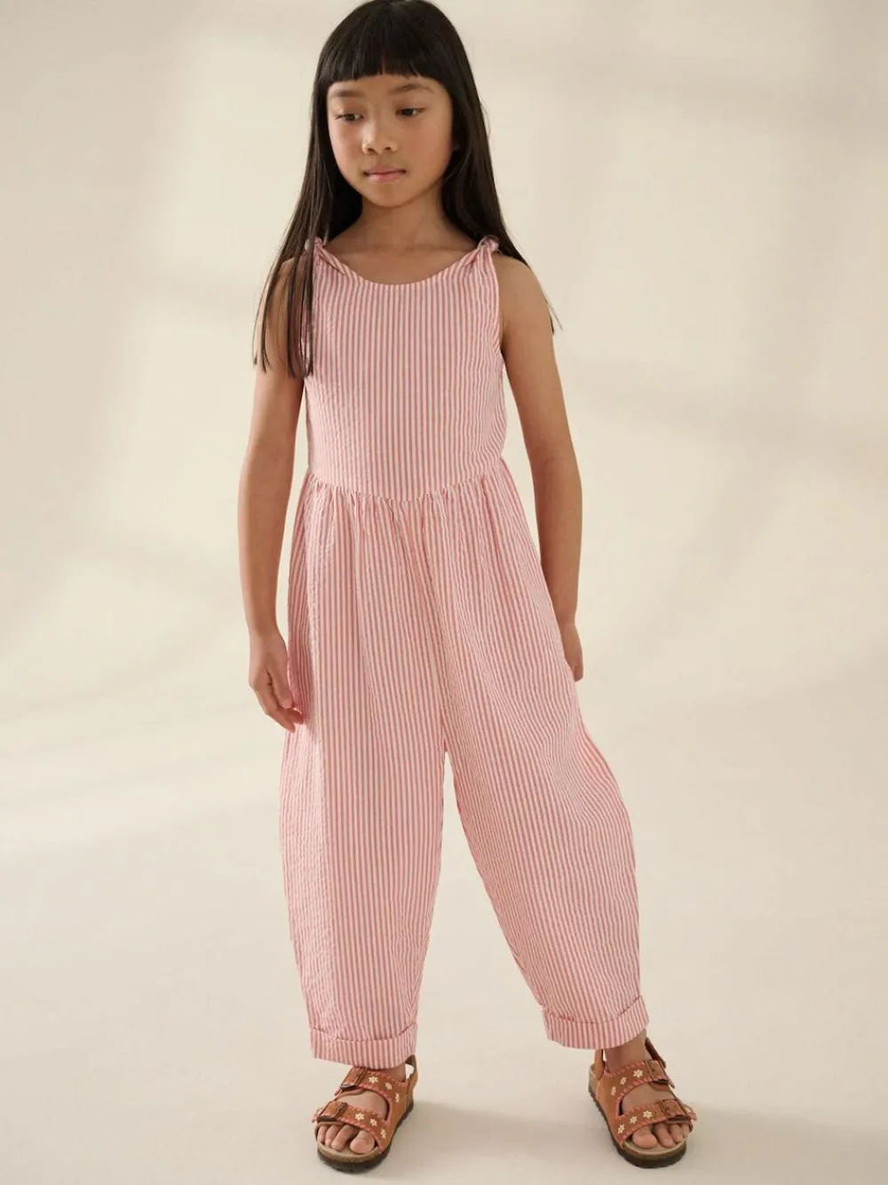 Made from pure cotton, this summer playsuit has an easy pull-on style with knot detailing to the shoulders, a turn-up hem to the ankle and barrel-shaped legs. 100% cotton Pull-on Sleeveless Tie detailing Turn-up hem 100% Cotton.