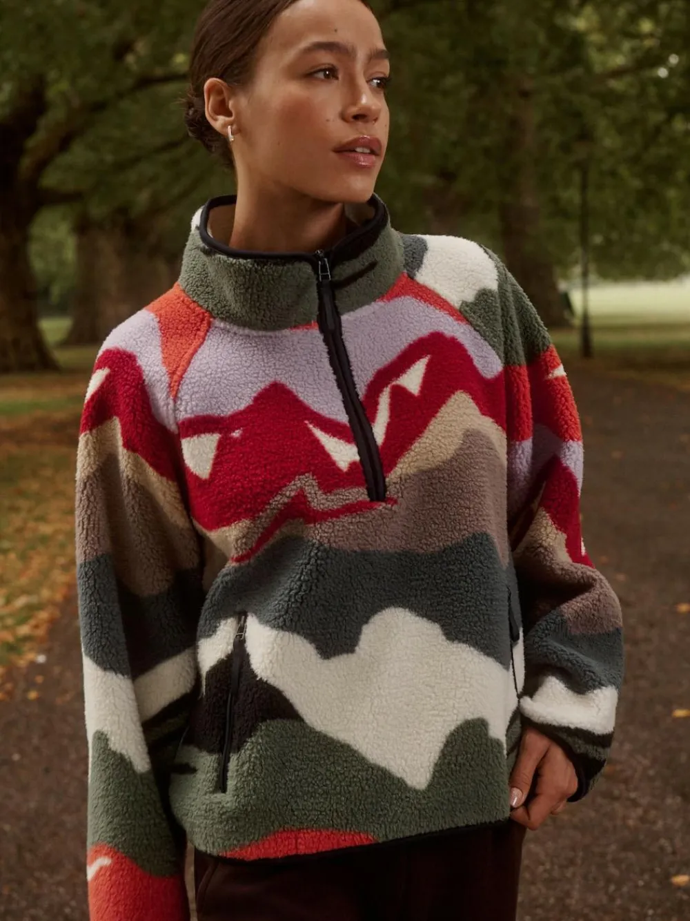 Stay warm during outdoor activities in this vibrant mountain print borg fleece jacket. Featuring a cosy quarter-zip fastening and practical fastened pockets, this piece is perfect for keeping warm during autumn and winter walks or workouts. Borg fleece fabric Mountain print Quarter zip fastening Fastened pockets Machine washable. 100% Recycled polyester.