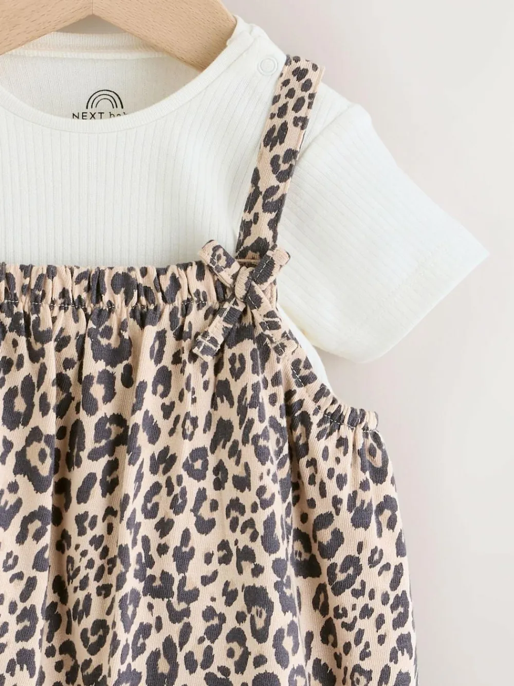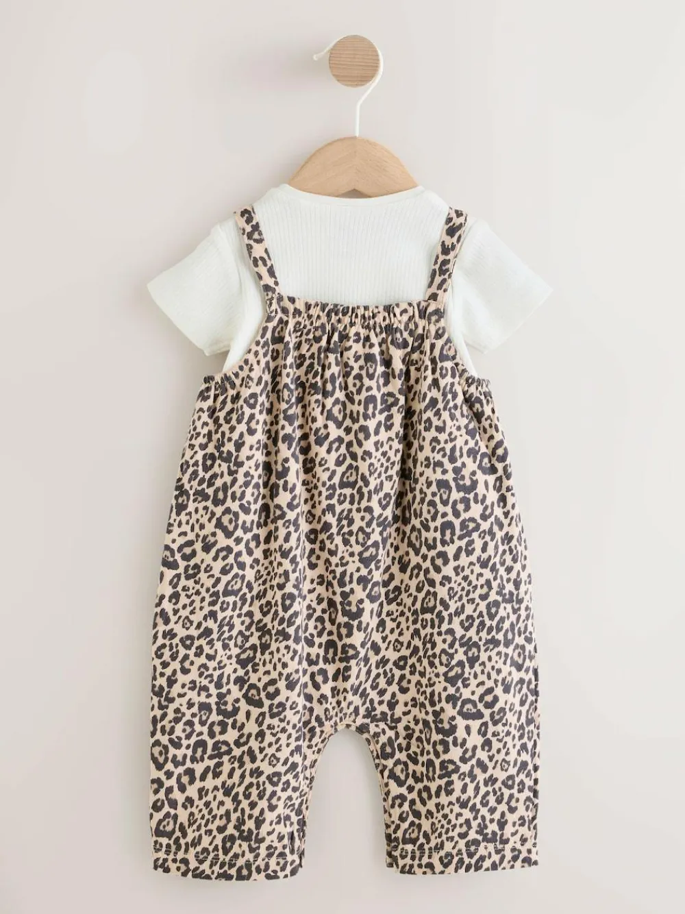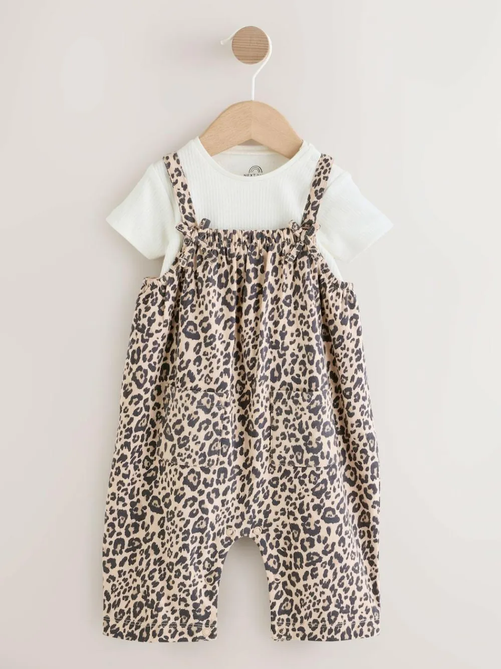 Dress your little one in this adorable 2 piece leopard print set, a fun and comfortable outfit for their day. The soft jersey dungarees feature an all-over leopard print and handy popper openings at the leg and back for easy dressing. The set includes a short-sleeved rib fabric bodysuit with nickel-free poppers at the crotch. Soft jersey dungarees with popper leg and back openings Short sleeve bodysuit in rib fabric Poppers at crotch No harmful chemicals or dyes Nickel-free poppers 2 piece set Machine washable. Dungaree Main 100% Cotton. Lining 100% Cotton. Bodysuit 100% Cotton. Warning: Keep away from fire and flames.