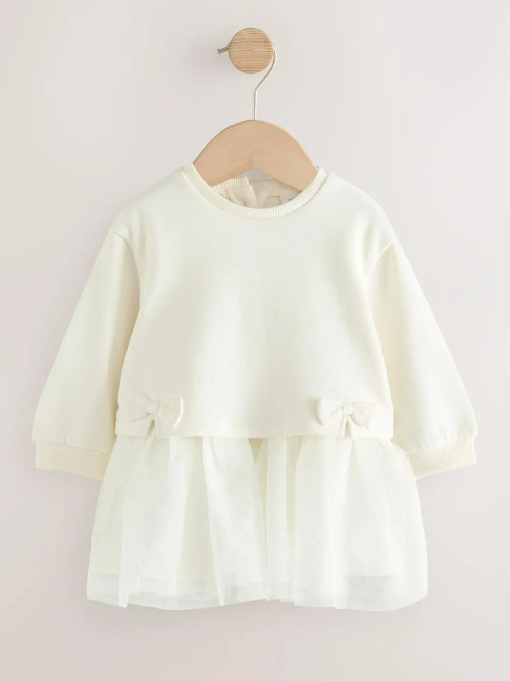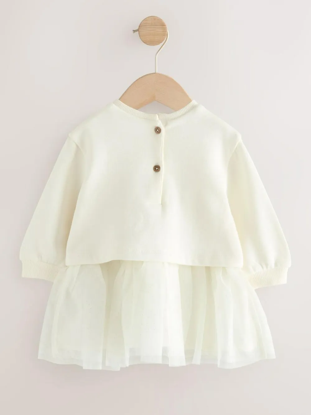 Your baby will look adorable in this pretty dress, featuring a layered design with a sweater bodice and a layered mesh skirt, finished in a soft lining. Regular fit Layered mesh skirt Soft lining Machine washable. Main 90% Cotton, 10% Recycled polyester. Mesh 100% Polyester. Warning: Keep away from fire and flames.
