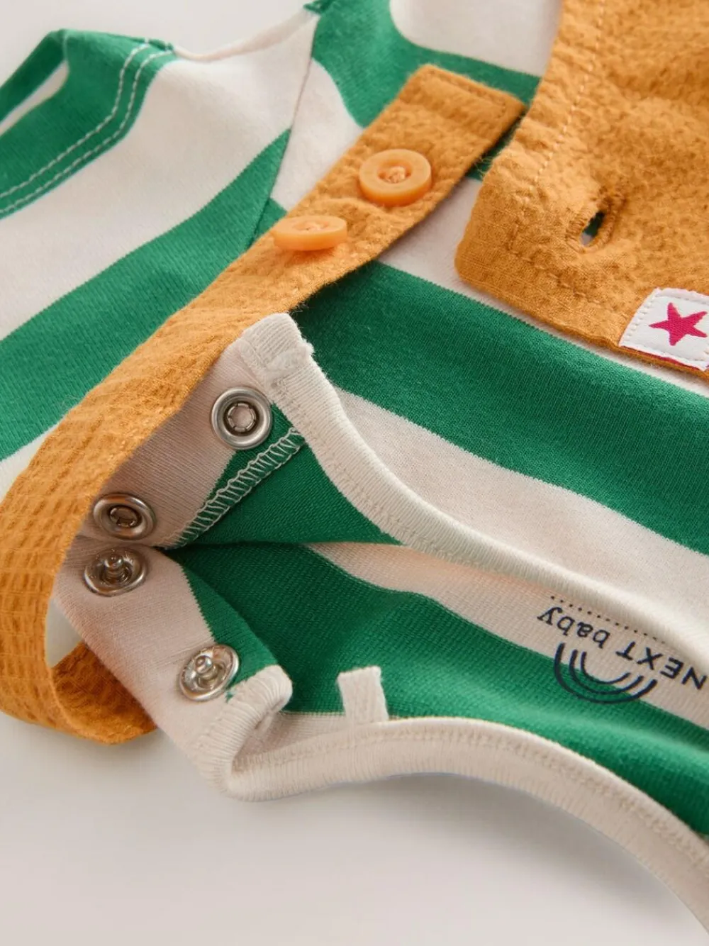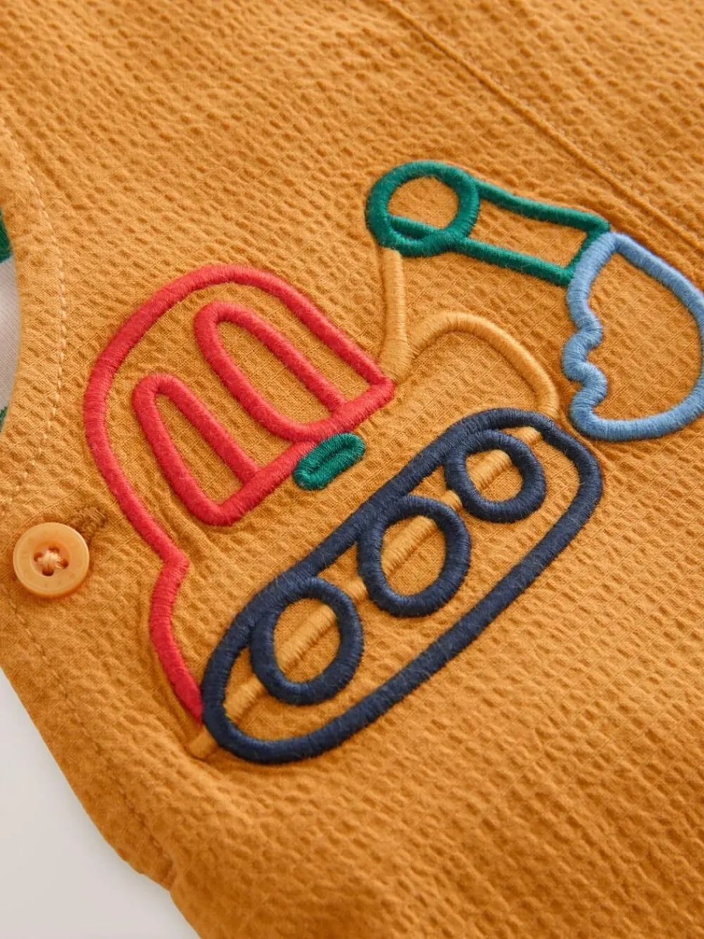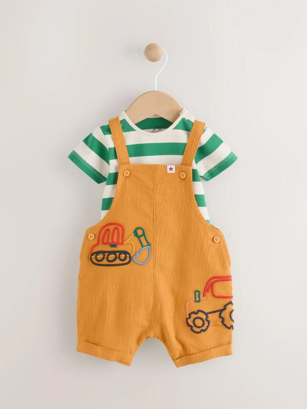 This 2-piece set is made up of a soft woven dungaree featuring a fun embroidered transport detail with adjustable length straps. Paired with a striped soft jersey bodysuit. 2 piece set Cotton rich Adjustable dungarees Soft jersey bodysuit Popper fastening Machine washable. Bodysuit 95% Cotton, 5% Elastane. Dungaree Main 98% Cotton, 2% Elastane. Lining 100% Cotton. Warning: Keep away from fire and flames.