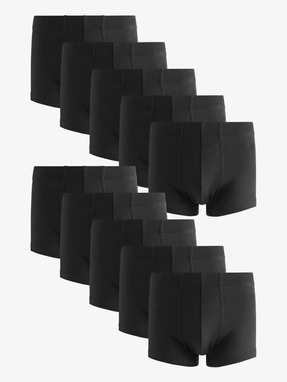 Available in a handy 10-pack, these cotton-blend black hipster shorts have a boxer shape with a slightly higher leg, finished with a minimal design and an elasticated waistband. Comfortable and classic. 10-pack Cotton-blend fabric Elasticated waistband Hipster shape Machine washable. 10 x Trunks (underwear) 95% Cotton, 5% Elastane.