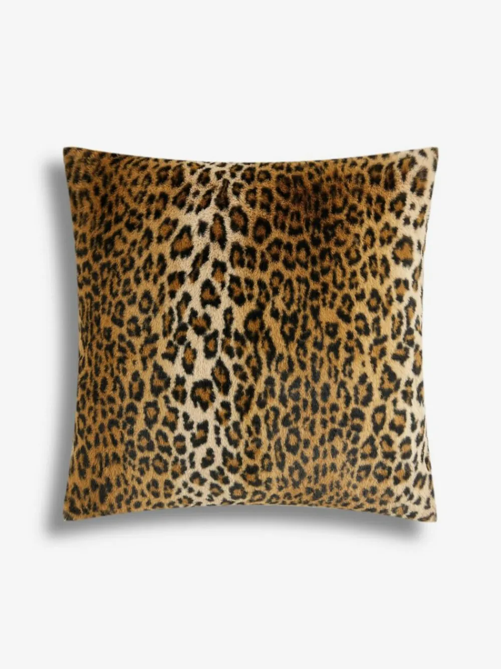 Embrace your wild side with this supersoft plush faux fur cushion. Inspired by the maximalist aesthetic, it works well with neutral tones or bright colours for adding texture and style. Matching throw also available for extra cosiness. Square cushion Faux fur fabric Leopard print Height 50cm Width 50cm Machine washable. 100% Recycled polyester. Polyester Pad Included.