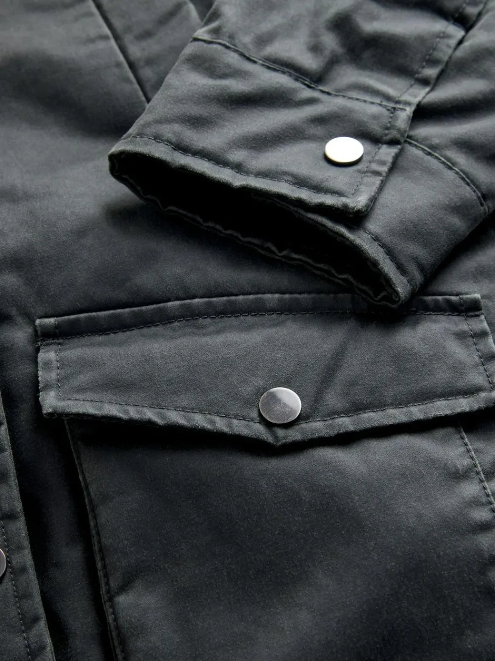 Introduce a timeless country style to the wardrobe with this classic Black Faux Waxed Jacket. This stylish piece achieves an authentic Wax look jacket without the upkeep. It features a sophisticated cord collar detail and a practical printed lining for extra comfort and character. Wax look jacket Printed lining Cord collar Machine washable. Main 66% Cotton, 34% Polyester. Lining 100% Recycled polyester. Collar 100% Cotton.