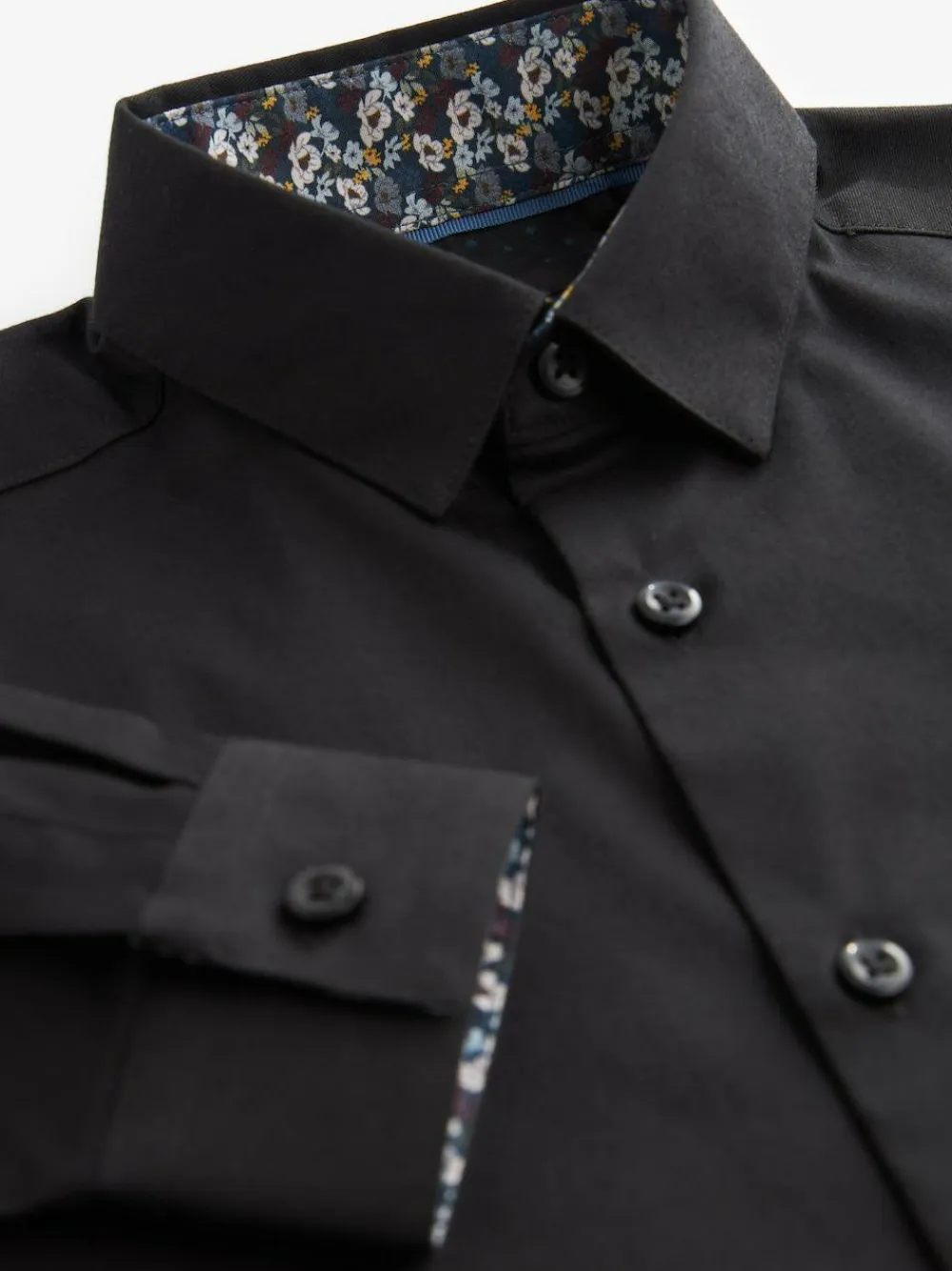 This smart button-up shirt in black is perfect for their formal looks, featuring a classic collar and a stylish trim, perfect for parties, events or school. 49% Cotton, 48% Recycled polyester, 3% Elastane.
