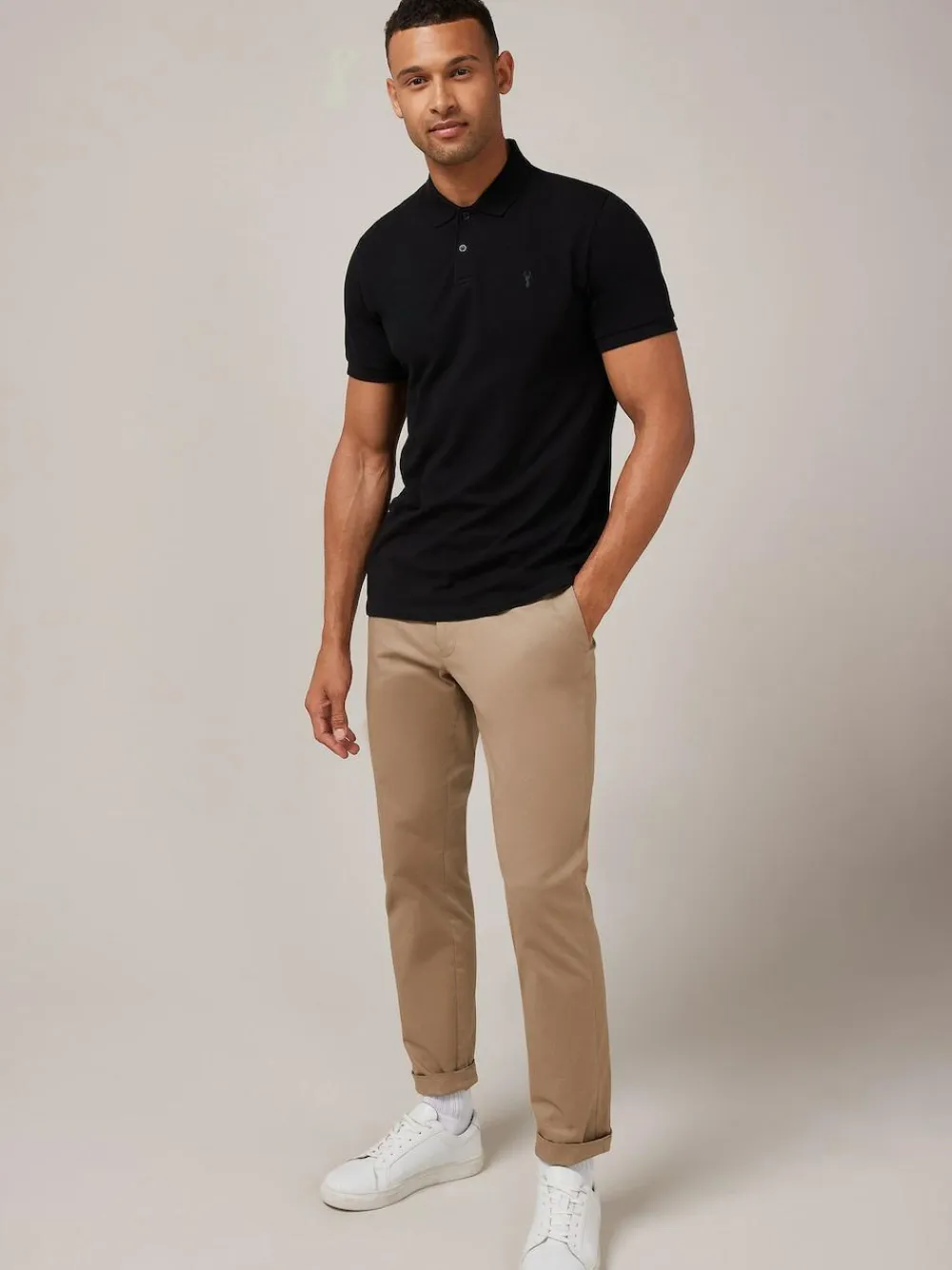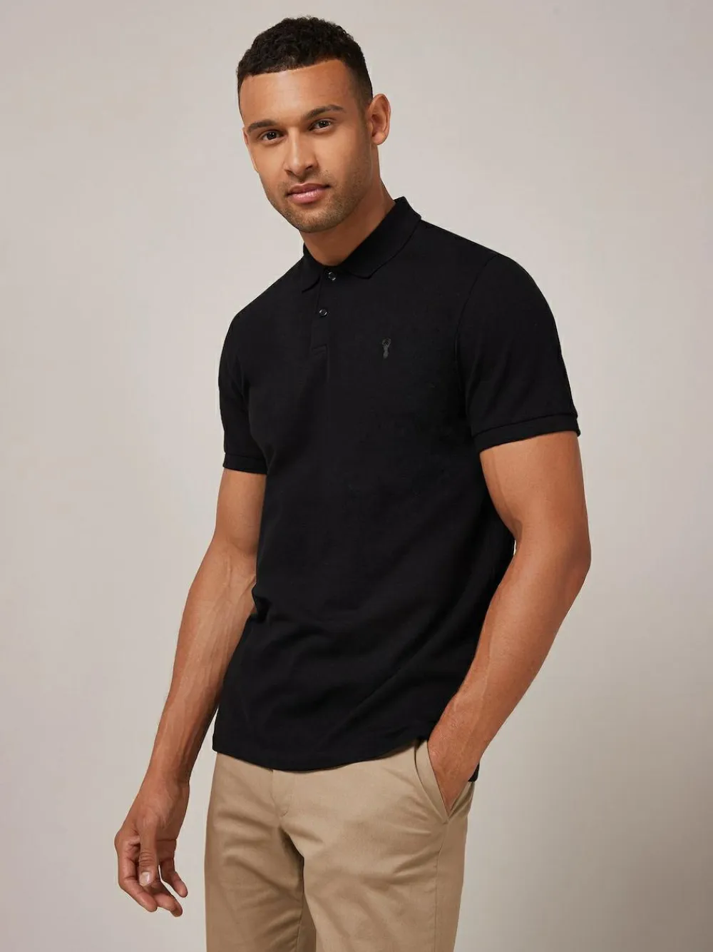 A wardrobe staple, our polo shirt in black is made from soft cotton pique for your comfort throughout the day. This classic silhouette can be dressed up or down to suit the occasion and boasts a traditional button-fastened placket on the neck, ribbed collar and cuffs and a stag embroidered detail on the chest. Smart casual staple Soft construction Dual-button neck Pointed collar Short sleeve Machine washable. 95% Cotton, 5% Elastane.