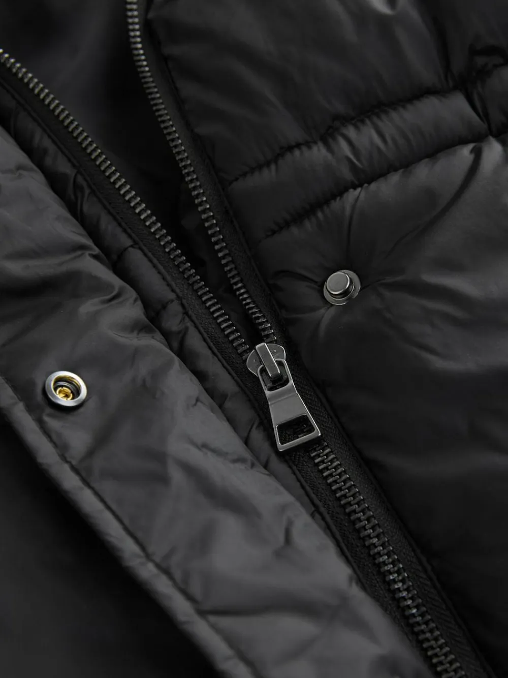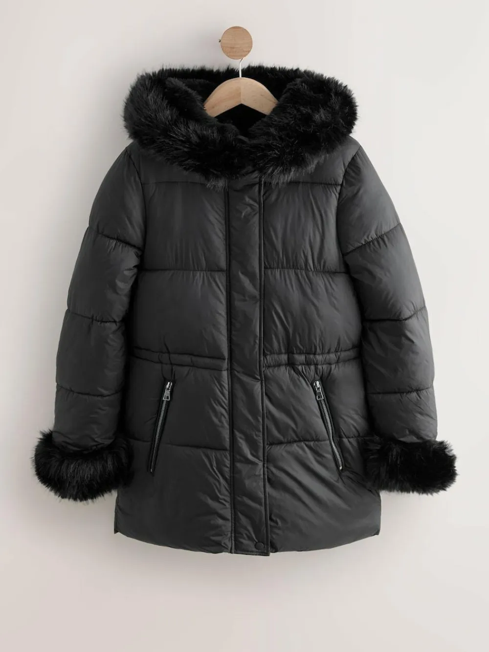 Next Black Short Padded Coat with Faux Fur Trim Hood and Cuffs^Women Coats & Jackets|Coats & Jackets