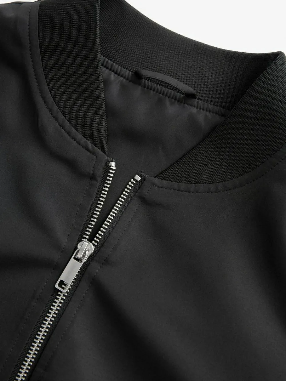 With a stylishly minimal design and a light-weight construction, this shower resistant black bomber jacket is perfect for casual or smart-casual looks. With a full-zip fastening, pockets and ribbed trims, this jacket is ideal for everyday wear. Regular fit Shower resistant Zip fastening Pockets Ribbed trims Machine washable. Shell 100% Recycled polyester. Lining 100% Recycled polyester.