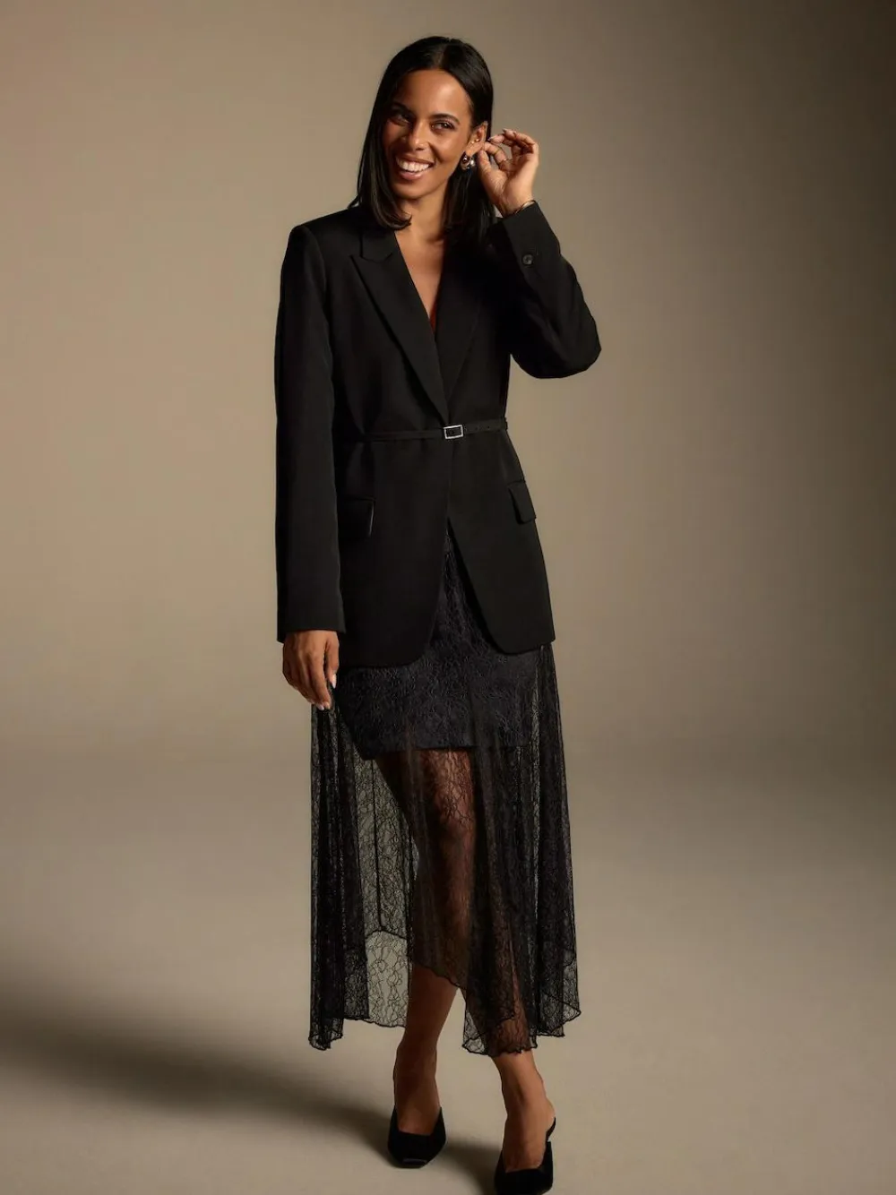 Elevate your style with this classic single-breasted blazer. The detachable black belt allows for versatile styling, creating a defined silhouette for a polished look. With a timeless design and flap pockets, it’s the perfect layering piece for both the office and evenings out. Single-breasted Detachable belt Notch lapel Flap pockets Button cuff detailing Regular centre back neck to hem 29″ / 74cm. Machine washable. Main 100% Recycled polyester. Lining 100% Recycled polyester. Items with the curve logo are available in sizes 18 and above., Our tall collection is designed to fit women 5’10” and above. This has been proportionally increased through the body, leg and sleeve to achieve the perfect fit. Available in sizes 8-20.