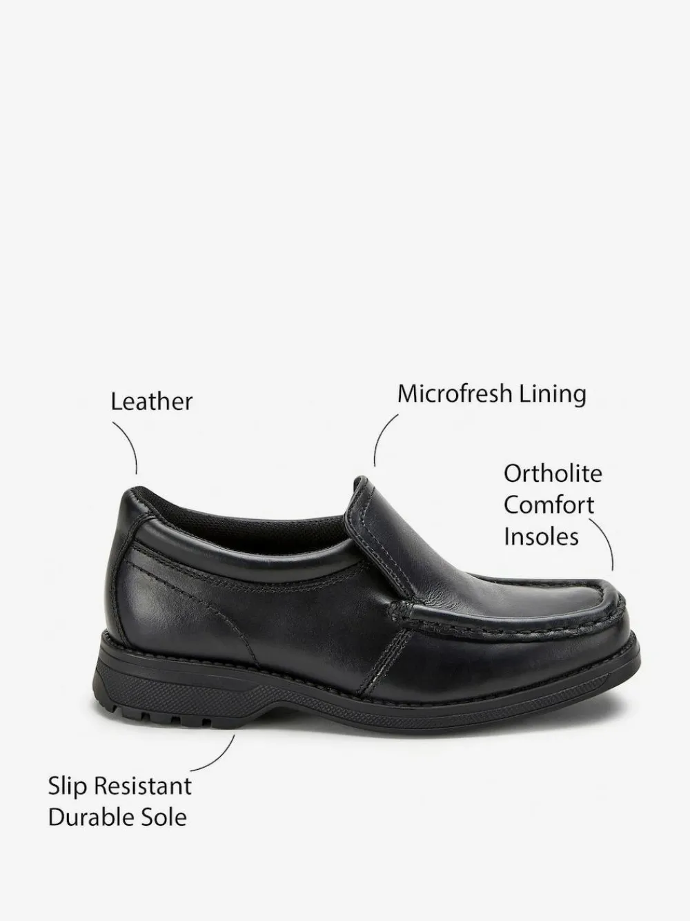 Perfect for school days, our leather loafers have been designed by our footwear experts, featuring a padded collar and Ortholite sock for comfort with every step. The leather upper is durable, with a stitched square toe and easy slip-on style. A Micro-Fresh® treatment has been added to the lining for fresh and dry feeling feet, finished with a chunky sole that boasts a specially designed tread pattern. Leather upper Square toe Standard fit Ortholite footbed Padded collar *Micro-Fresh® treated linings to fight odour causing bacteria – contains the biocide silver chloride. View the How to Measure and Fit at Home Guide View the How to Measure and Fit at Home Guide Upper – Leather, Lining & Sock – Textile, Sole – Other Materials.