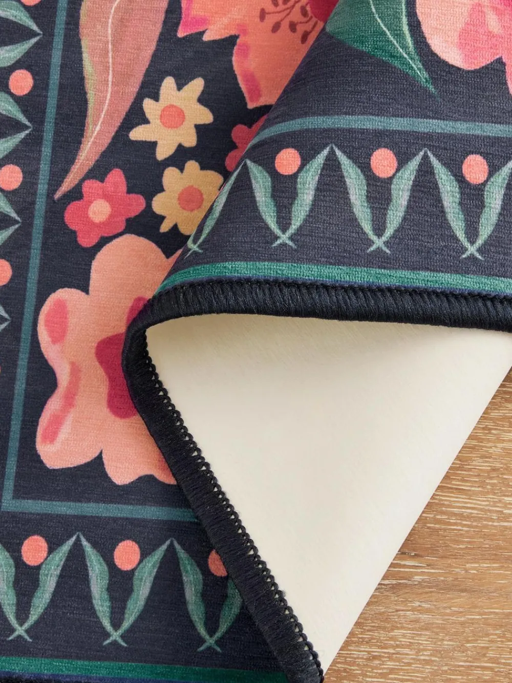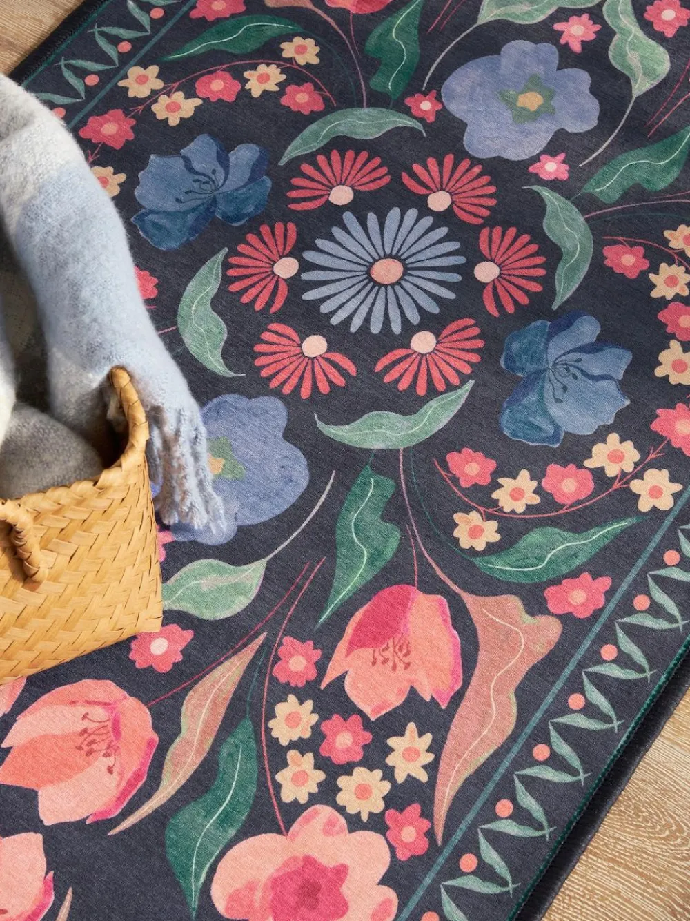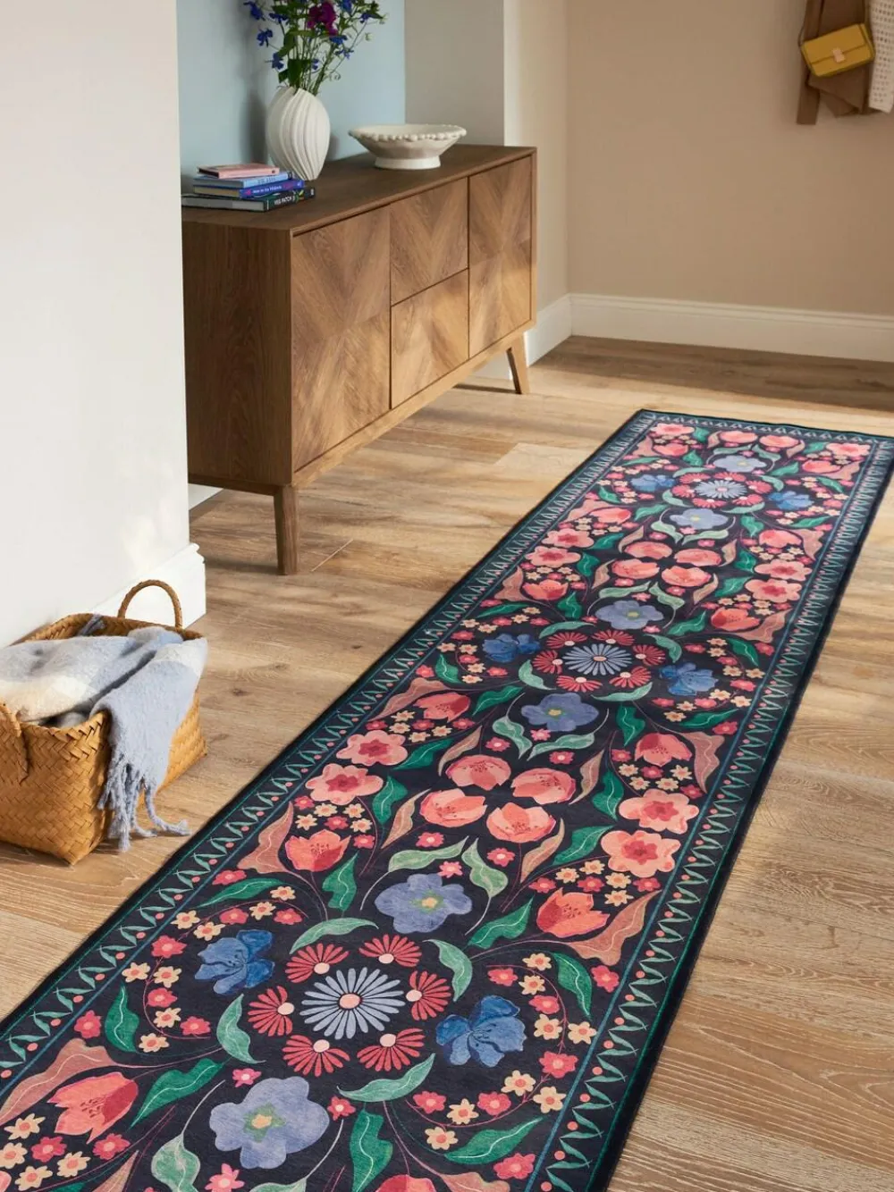 This floral print runner is not only a bold and fun design, but also practical due to its foldability for convenient storing and machine washing. Durable and easy to care for due to the use of synthetic fibres. We recommend a regular light vacuum to remove any loose fibres from the surface. Blot any spills immediately with a dry, absorbent white cloth or white paper towel. For machine washing, place on a 30-degree gentle cycle, remove from the washing machine promptly to reduce creasing and line dry. We recommend washing before first use to help remove any creases formed in transit. Machine washing makes this rug perfect for high-traffic areas. For indoor use only. Floral print Durable Easy to care for Small Runner Length 200cm x Width 66cm. Large Runner Length 300cm x Width 66cm. Small Runner Length 200cm / Width 300cm Large Runner Length 300cm / Width 300cm Machine washable. 100% Recycled polyester.