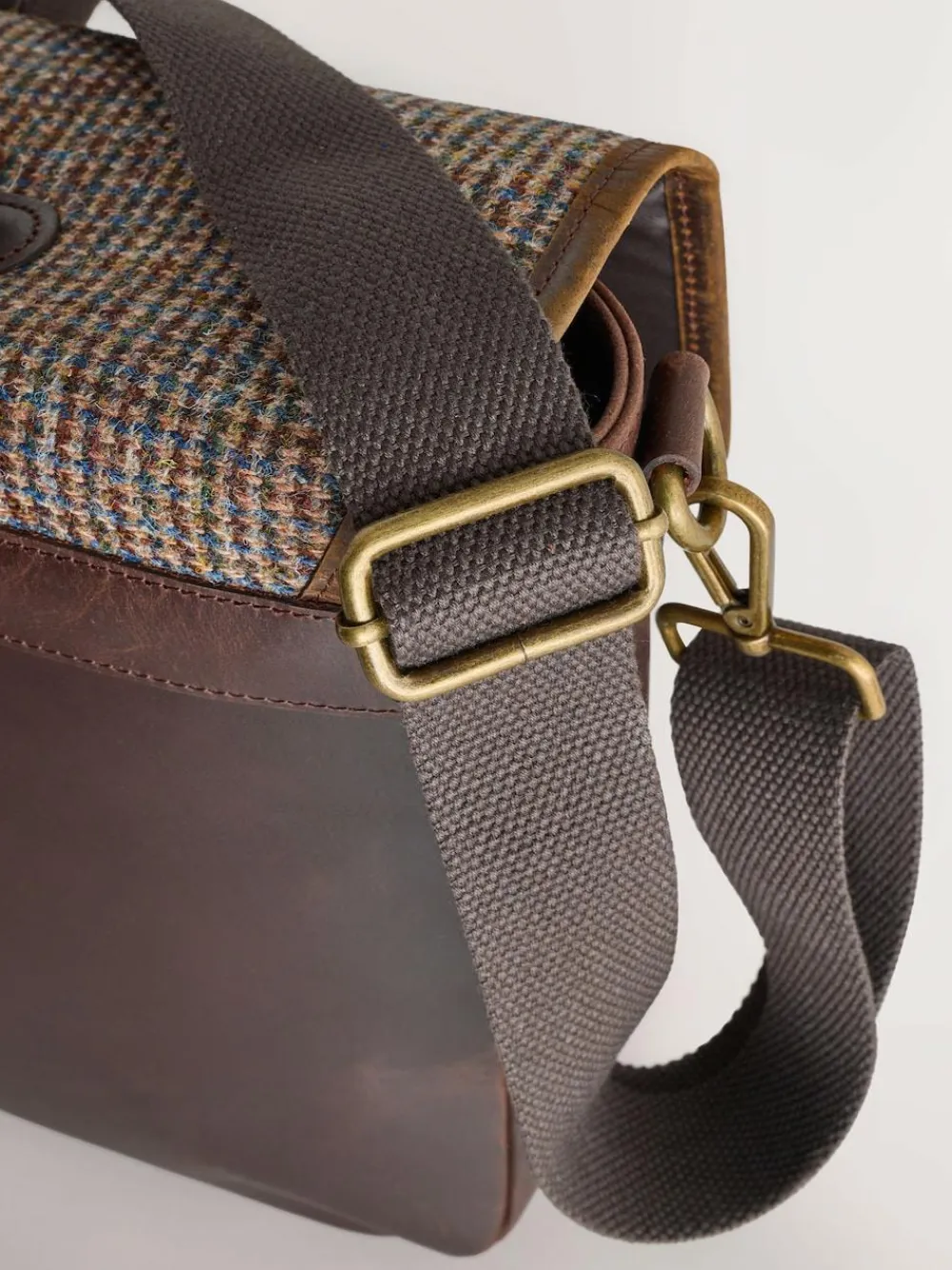 This distinguished Harris Tweed messenger bag is the ideal accessory for the modern professional. Crafted from a luxurious combination of genuine leather and authentic Harris Tweed wool, it offers a refined look for work or smart-casual occasions. Finished with antique brass hardware and a secure internal zip pocket. Brown Messenger Bag Genuine leather and Harris Tweed Antique brass finish Internal zip pocket Adjustable shoulder strap Height 38cm Width 38cm Depth 13cm Main 100% Wool. Lining 100% Polyester. Panel 100% Leather.